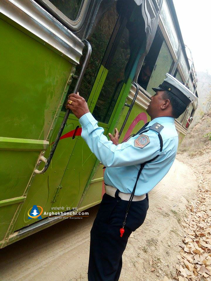 फुदवाङ नजिक अउलाखोलामा चेकिङ क्रममा यात्रु, चालकलाई प्रशिक्षण दिदै। भिडियो: प्रेम खडका, अर्घाखाँचीडट्कम