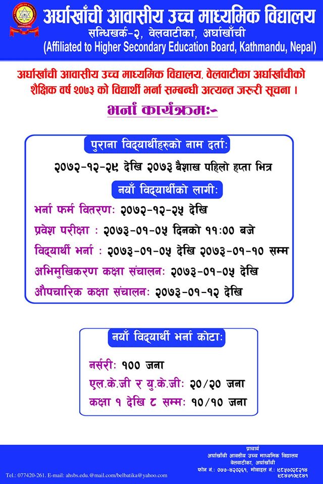 अर्घाखाँची आवसिय उच्च माविमा २०७३ सालको नयाँ भर्ना सम्बन्धी सूचना
