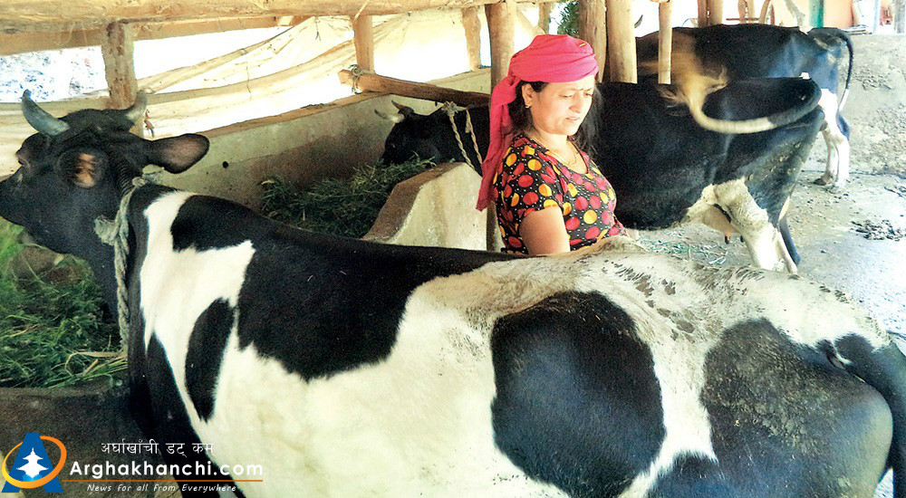 किमडाँडा घोचेखोलाकी जानका बञ्जाडे गाई फर्ममा । तस्बिर: वीरेन्द्र केसी, अर्घाखाँचीडट्कम