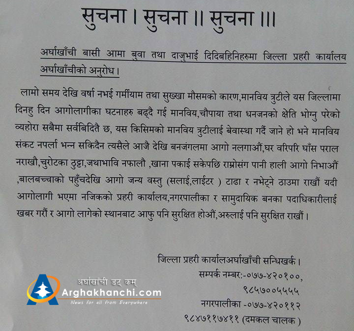 लामो समय देखिको खडेरीले गर्दा अर्घाखाँचीभर आगलागीका घटना दैनिक भईरहेका छन् । आगलागीबाट ज्यान जानुका साथै करोडौ बराबरको धनजनको नोक्सान भएको छ ।