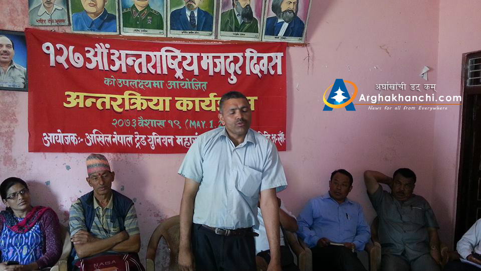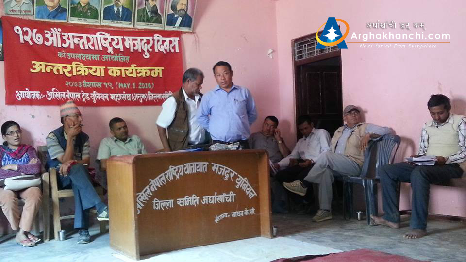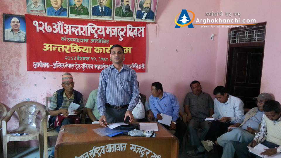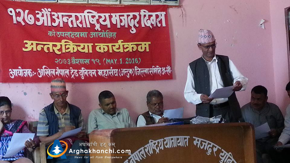 सन्धिखर्क, अर्घाखाँची  । राष्ट्रिय जनमोर्चा निकट अखिल नेपाल ट्रेड युनियन महासंघ (अन्टुक) जिल्ला समिति अर्घाखाँचीको आयोजनामा १२७ औं अन्तराष्ट्रिय मजदुर दिबसको अबसरमा “मजदुरहरुको समस्या र हाम्रो भुमिका” बिषयक अन्र्तक्रिया कार्यक्रम सन्धिखर्कमा सम्पन्न भएको छ ।