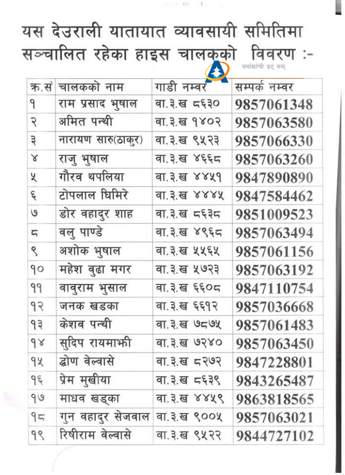 आगामी जेष्ठ १ गतेबाट लागु हुने गरी सवारी नियम बिपरित सवारी चलाउने चालकलाई जुनसुकै समयमा पनी सोही अनुसारको कारबाही गरीनेहुँदा सम्पूर्ण यातायात ब्यवसायी, चालक, सवारीधनी तथा आम नागरीकहरुमा जनचेतनाको लागी अपिल समेत गरेका थिए कार्यक्रम देउराली यातायात व्यबसायी समितिका अध्यक्ष योगेन्द्र खड्का को बिशेष उपस्थितिमा सम्पन्न भएको थियो ।