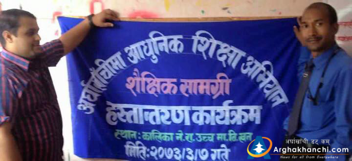 कार्यक्रमलाई भब्यताको साथ सन्देश मुलक बनाउन आधुनिक शिक्षा अभियानका पदाधिकारीहरु उपादक्ष्य सुशीला पराजुली,सोही विद्यालयका अभियान सह संयोजक तथा साउदी प्रतिनिधि प्रमुख समाजसेवी गिरिराज खनाल,स्वतन्त्र पत्रकार संघ नेपाल अर्घाखाँचीका अध्यक्ष हरी प्रसाद भुसाल “नेपाली”,पत्रकार एवं अन्तराष्ट्रिय अर्घाखाँची संपर्क मन्चका महासचिव डिल्लिराज घिमिरे,स्थानीय समाजसेवी,अभिभावक,बिद्यार्थी,राजनिती प्रतिनिधि तथा सरोकारवालाको उपस्थितिमा शैक्षिक सामाग्री हस्तान्तरण गरिएको छ । यस कार्यक्रममा अभियान्ता सह-संयोजक गिरीराज खनाल,अन्तराष्ट्रिय अर्घाखाँची संपर्क मन्चका महासचिव डिल्लिराज घिमिरे,अभियानको उपादक्ष्य सुशीला पराजुलीले संयुक्त रुपमा विद्यालयका प्राचार्य भुवन खनाल र विद्यालय व्यावस्थापन समिति अध्यक्ष वाल कृष्ण आचार्यलाई हस्तान्तरण गर्नु भएको छ ।