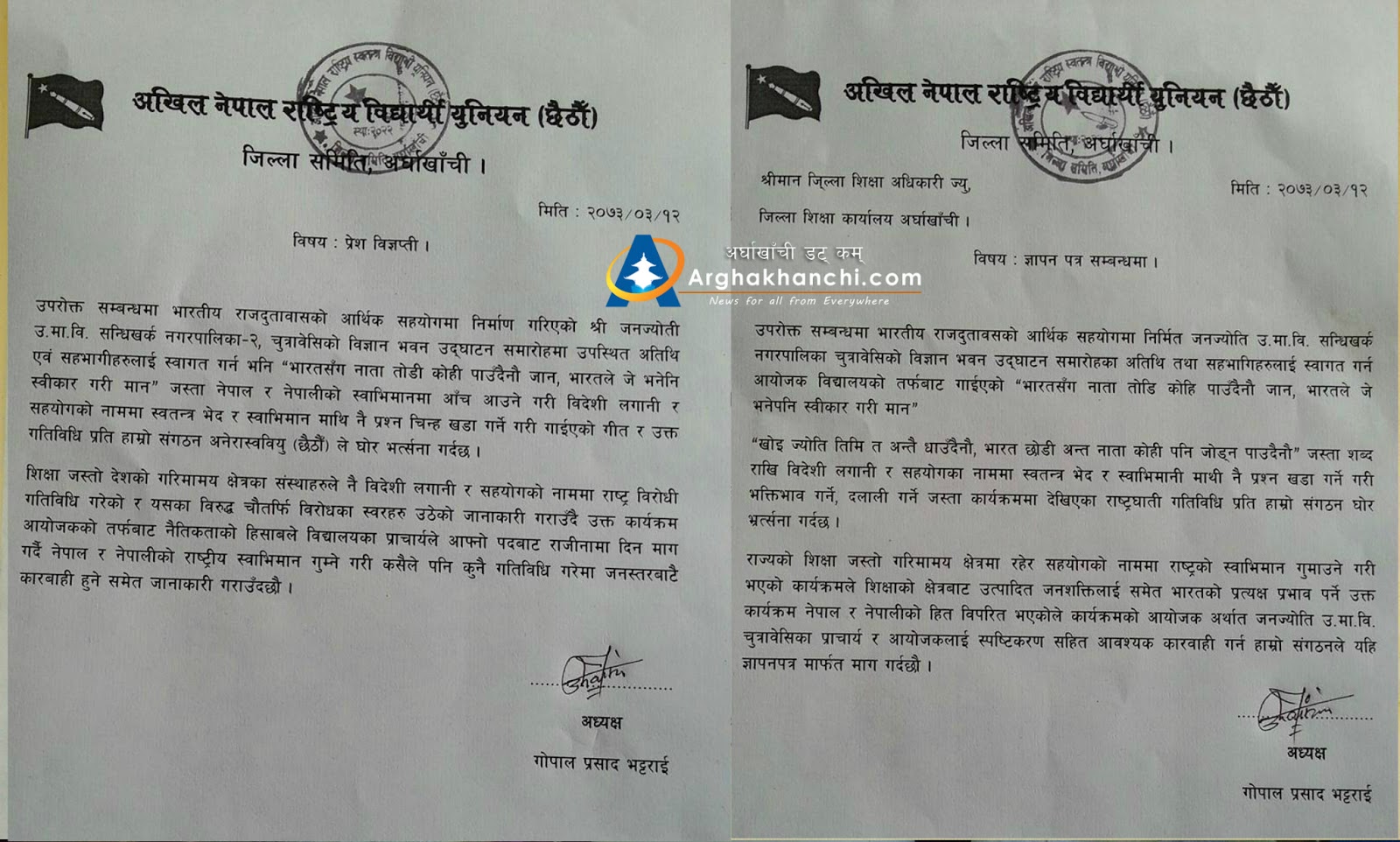 अर्घाखाँचीमा भारतीय राजदुतावास: जनज्योती चुत्राबेशी, शान्ती उमावि वागी र अर्घारजस्थल मावि उद्घाटन र सिला लेखको विषयलाई लिएर चर्को विरोध र आपत्ति