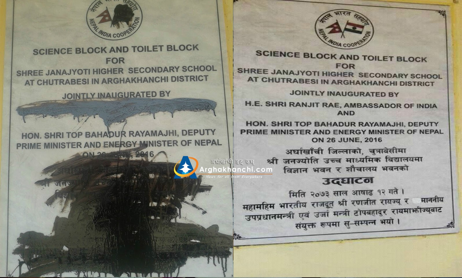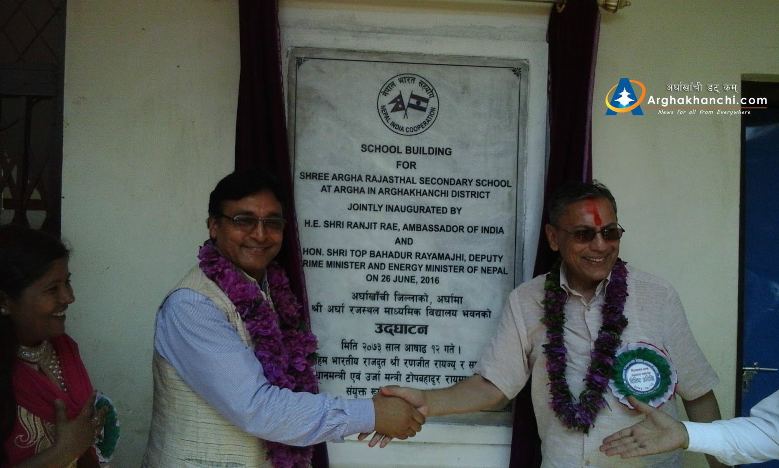 2. On June 26 2016, Ambassador of India ShriRanjit Rae and Deputy Prime Minister and Minister for Energy, Government of Nepal, Shri Top Bahadur Raymanjhi jointly inauguratedthe newly constructed science block of Shree Janajyoti H.S. School, Chutrabeshi in Arghakhanchidistrict. The double storied building of the school, which has been constructed with Government of India’s financial grant of NRs.19.60 millions, has 8 class rooms, separate rest rooms for boys and girls, as well as school furniture and equipments.