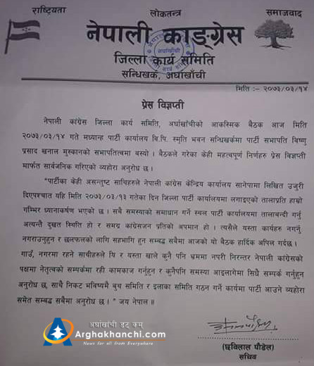 असन्तुस्ट पक्षहरुको बहकाउमा नलागी पाटी संगठनको काममा अगाडी बढ्न पनि कार्यक्रतालाई विज्ञप्ती मार्फत जानकारी गराइएको छ ।