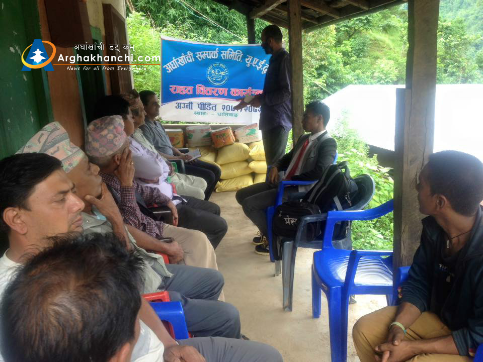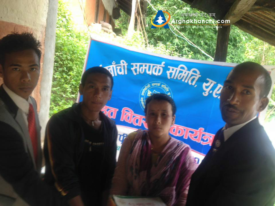 अर्घाखाँची सम्पर्क समिती युएई मार्फ़त संकलन गरिएको राहत सहयोग वितरण योजना वमोजिम पहिलो चरणमा अर्घाखाँचीका चार गावीस जुकेना,खन,असुरकोट र धातिवाँङमा लक्षित गर्दै पहिलो चरणको अन्तिम राहत वितरण कार्यक्रम २०७३ साउन १७ गते धातिवाँङ गाविस भवनमा एक औपचारिक कार्यक्रम विच सम्पन्न भएको छ ।