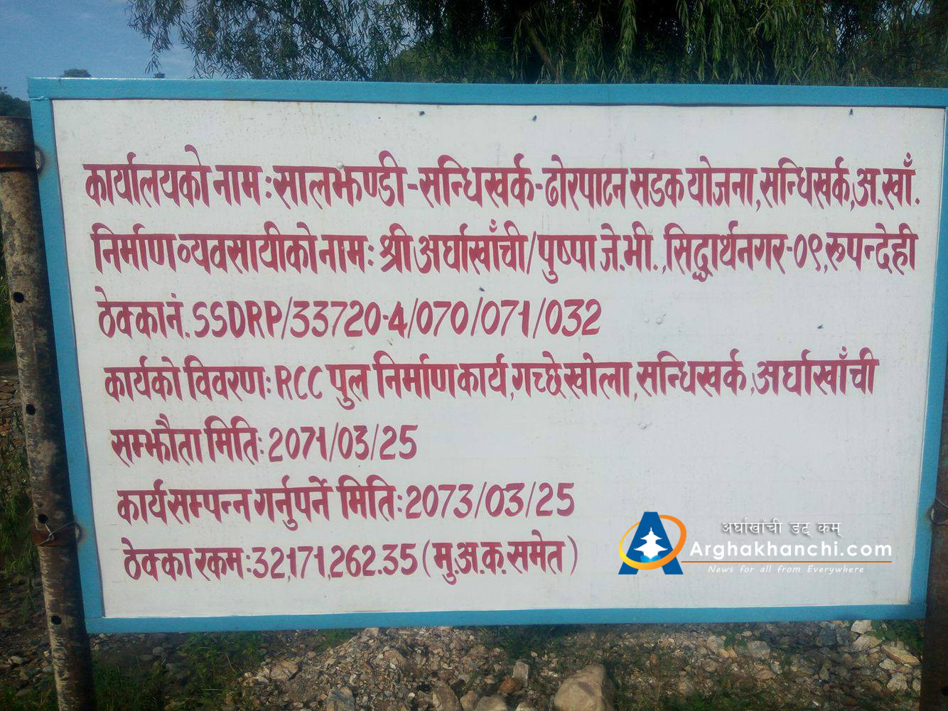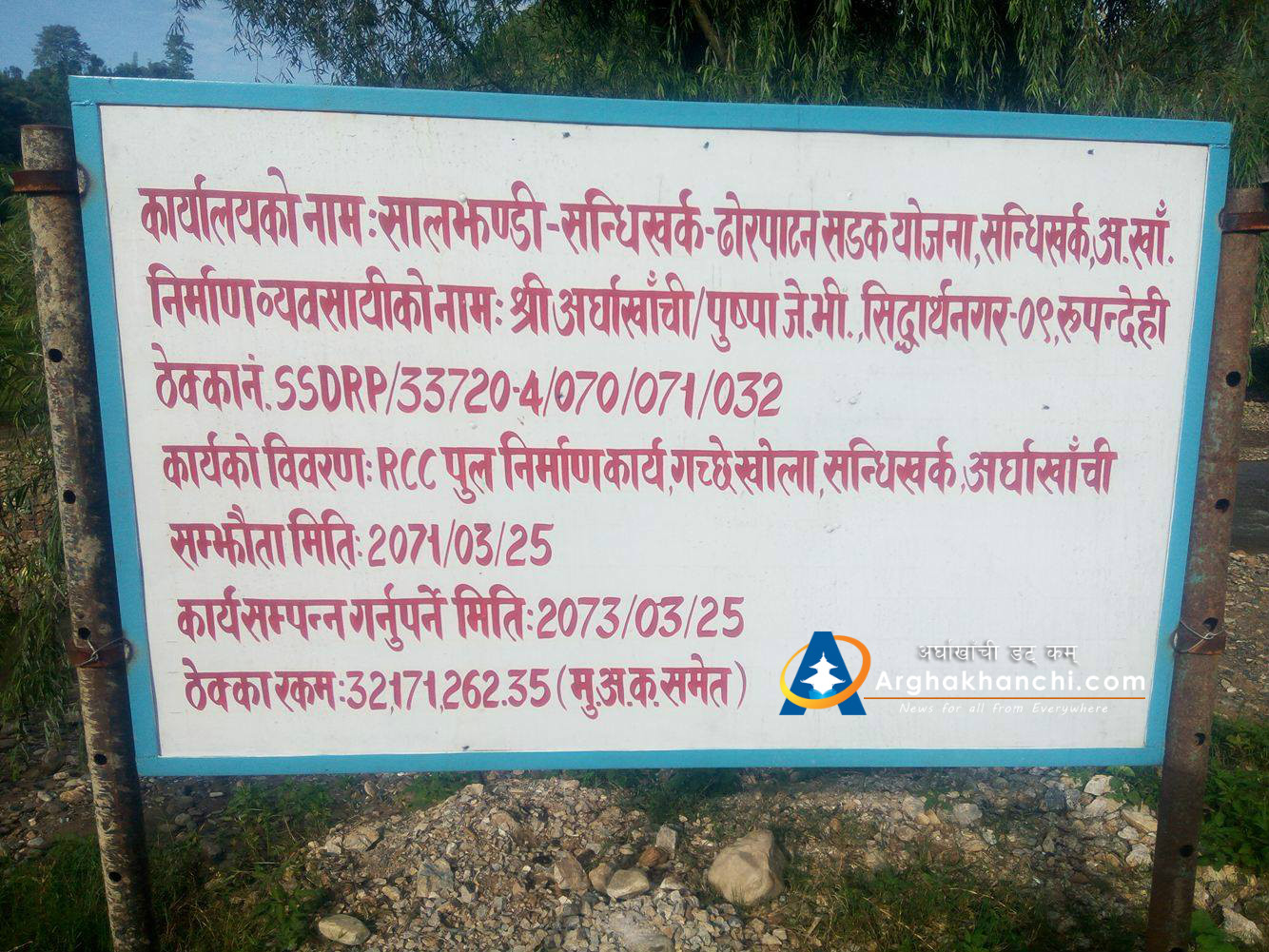 गच्छेखोला, अर्घाखाँची । अर्घाखाँची जिल्लाको सन्धिखर्क नगरपालिका स्थित गच्छेखोलामा सालझण्डीदेखि सन्धिखर्क हुँदै ढोरपाटनसम्मको ट्रयाक अन्तर्गत बन्दै गरेको पक्की पुल । पुल २०७३ को असार २५ गते सम्म सम्पन्न हुनपर्नेमा अहिले सम्म पुरा हुन सकेको छैन । पुलको कुल लगानी ३ करोड २१ लाख रुपैया बढी रहेको छ ।