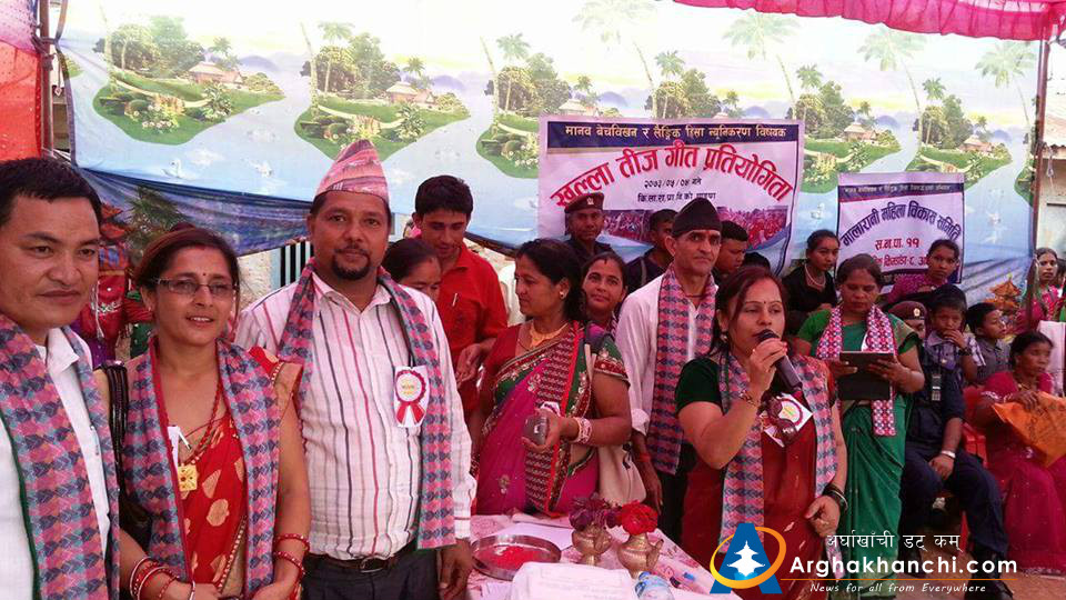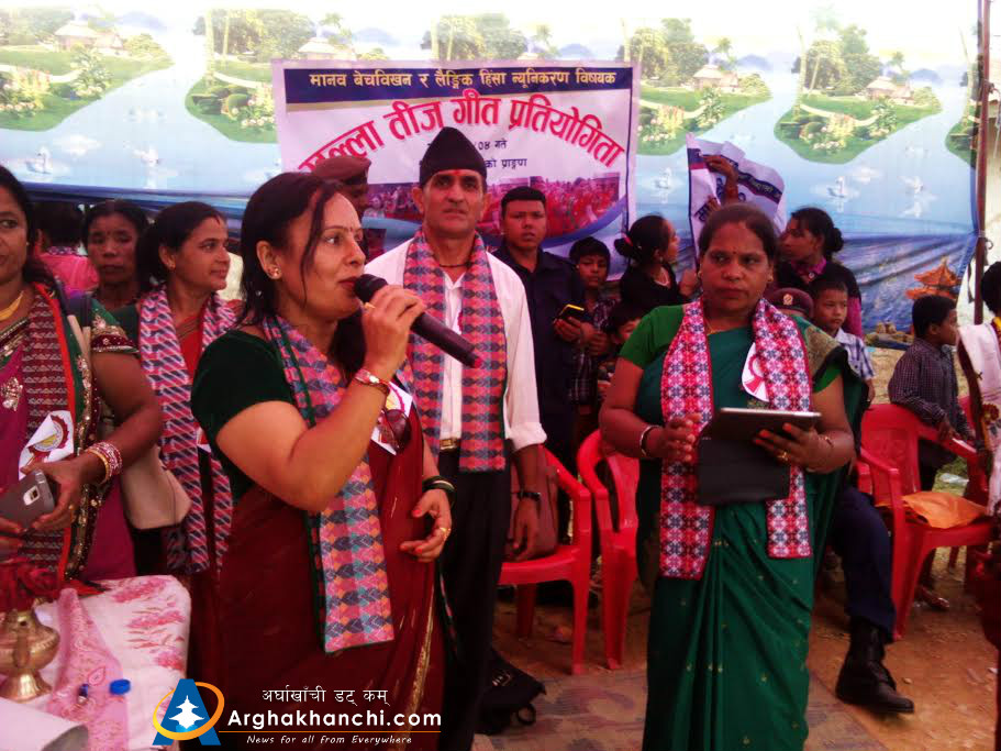 बिभिन्न संघ-संस्था,महिला समुहबाट गरी १२ वटा टिमले प्रतिस्प्रधा गरेको मानव बेचबिखन र लैङ्गिक हिंसा न्युनिकरण बिषयक खुल्ला तिजगित प्रतियोगिता कार्यक्रममा महिला तथा बाल-बालिका कार्यालय अर्घाखाँचीकी कार्यालय प्रमुख दिपा घिमिरेले प्रमुख अतिथिको रुपमा शुभकामना मन्तव्य राख्दै पछिल्लो समयमा बढ्दै गएको मानवबेचखिन र लैङ्गिक हिंसा न्युनिकरण गर्न घरबाटै सचेत हुनुपर्ने भन्दै चाडपर्वहरुलाई पनि अभियानको रुपमा अगाडि बढाउनुपर्ने धारणा राख्नुभयो ।