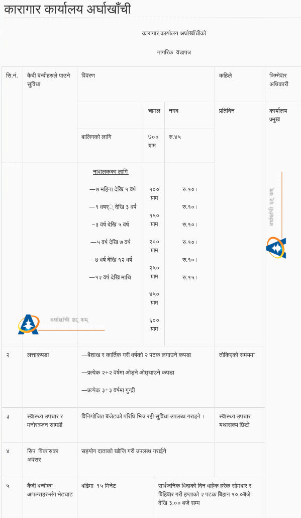 जिल्ला कारागार अर्घाखाँचीका कैदीबन्दीहरुले पाउने सुबिधा यस्तो छ: