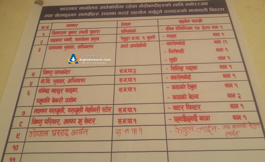 आटिकापाटा- सन्धिखर्क, अर्घाखाँची ( अर्घाखाँचीडट्कम) । अर्घाखाँची जिल्लाको सन्धिखर्क स्थित जिल्ला कारागार अर्घाखाँचीका कैदीबन्दीहरुलाई मनोरन्जन र खेलकुदका सामाग्री प्रदान गरिएको छ ।