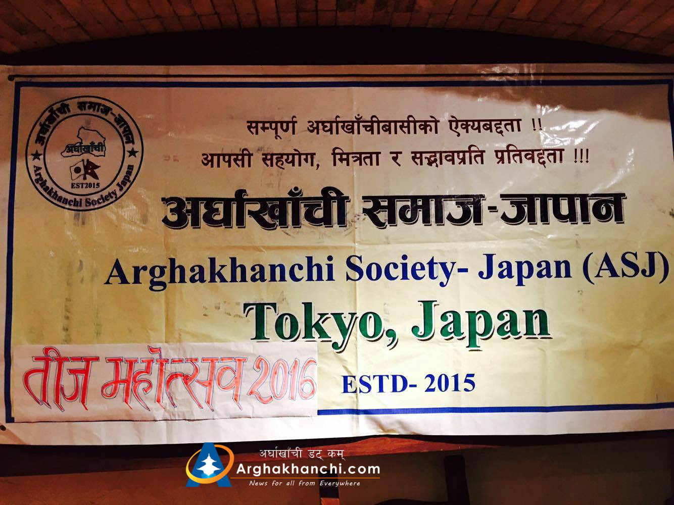 अर्घाखाँचीबाट जापानमा आई बिभिन्न  पेशा ब्यवसायमा छरिएर रहेका दाजुभाई  दिदिबहिनीहरु   बीच आपसी मित्रभाव बढाउदै सुख-दु:ख  एक आपसमा सहयोग गर्ने उदेस्यले गत बर्ष स्थापना भई सुरु गरिएको तीज बिशेष कार्यक्रममा उपस्थित सबैलाई अर्घाखाँची   समाज जापानका  अध्यक्ष ज्योतिश घर्ति मगर, धारापानी समाजका अध्यक्ष कृष्ण के.सी लगाएतले  हार्दिक धन्यवाद  एवम  तीजको शुभकामना  दिनु भएको थियो । कार्यक्रमको सहजिकरण दिपक थापाले गर्नु भएको जापान बाट अर्घाखाँची   समाज जापानका  अध्यक्ष ज्योतिश घर्ति मगर ले जानकारी दिनु भएको छ ।