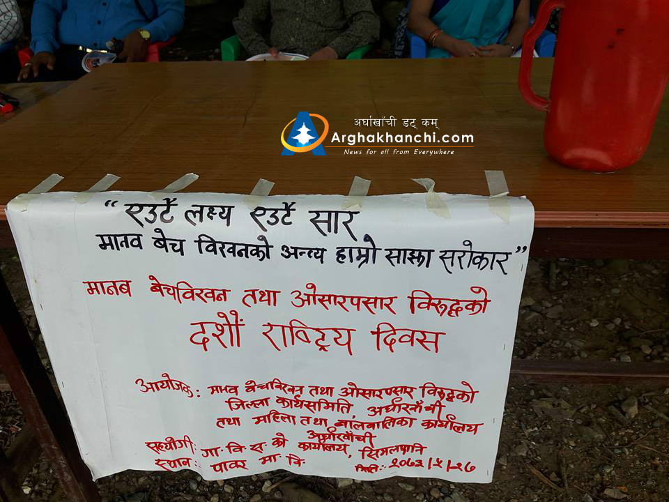 कार्यक्रममा जिल्ला प्रहरि कार्यलयका प्रहरी निरिक्षक कुल प्रसाद चौधरी, नेपाल बार एसोसियसनका टिका भुसाल, महिला बिकास अधिकृत दिपा घिमिरे लगायतले मन्तब्य राख्दै बेचबिखनका घटना हुन नदिनका लागि सबै सचेत हुनु पर्ने बताउदै अर्घाखाँचीमा त्यस्ता खालका घटना नभएको जिकिर गरेका थिए ।