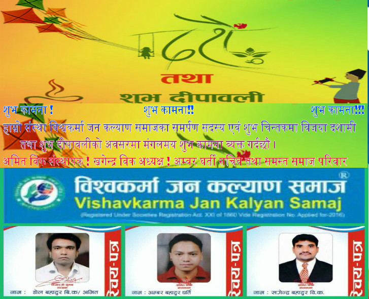 हाम्रो संस्था विश्वकर्मा जन कल्याण समाजका समर्पण सदस्य एवं शुभ चिन्तकमा विजया दशामी तथा शुभ दीपावलीको अवसरमा मंगलमय शुभ कामना व्यक्त गर्दछौ ।