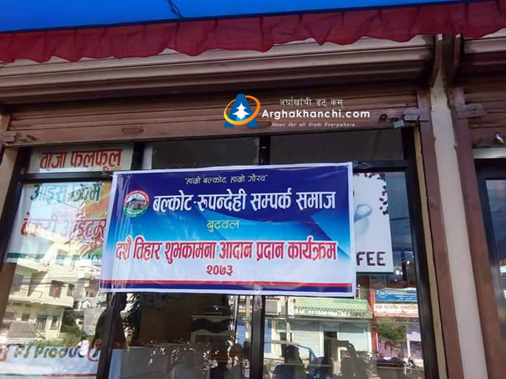 बुटवल ( अर्घाखाँचीडट्कम) । अर्घाखाँची जिल्लाको बल्कोटबाट रुपन्देहीमा बस्दै आएका बल्कोटबासीको  दशै तथा तिहार शुभकामना आदान- प्रदान कार्यक्रम सम्पन्न भएको छ ।