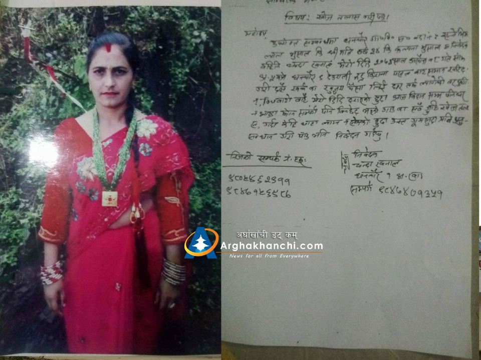 धनचौर, अर्घाखाँची ( अर्घाखाँचीक्डट्कम) । अर्घाखाँची जिल्लाको धनचौरमा एक महिला चार दिन देखि बेपत्ता भएकी छिन् ।