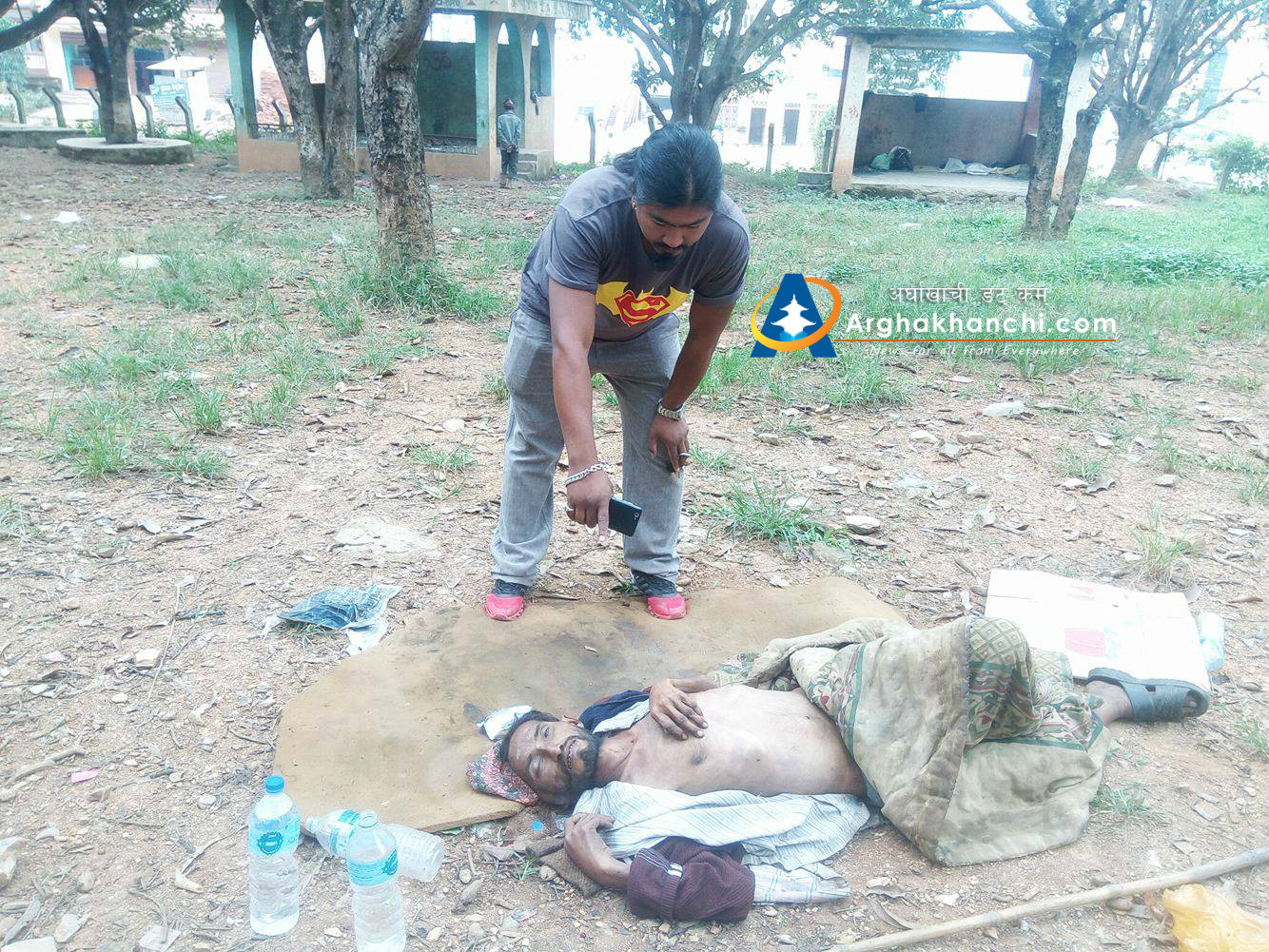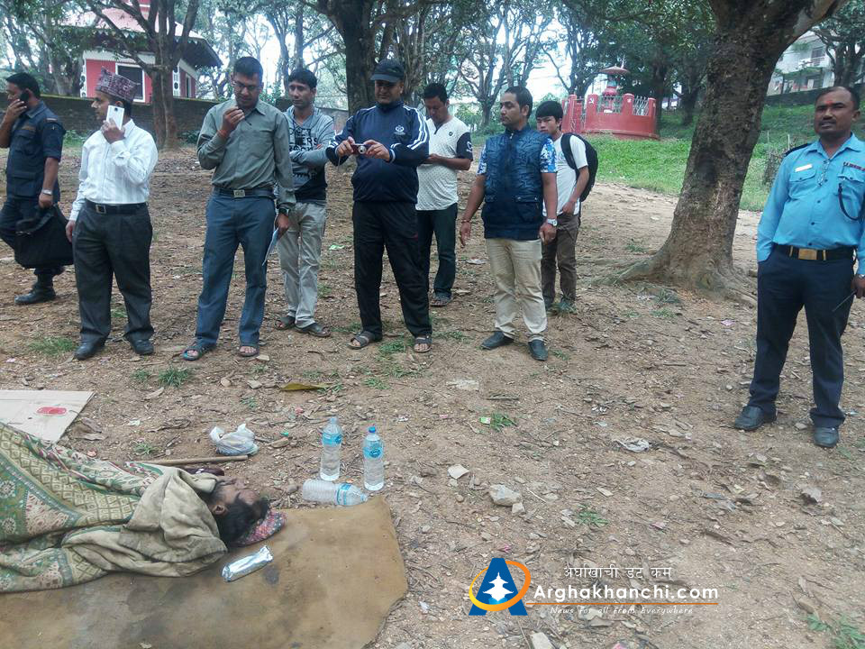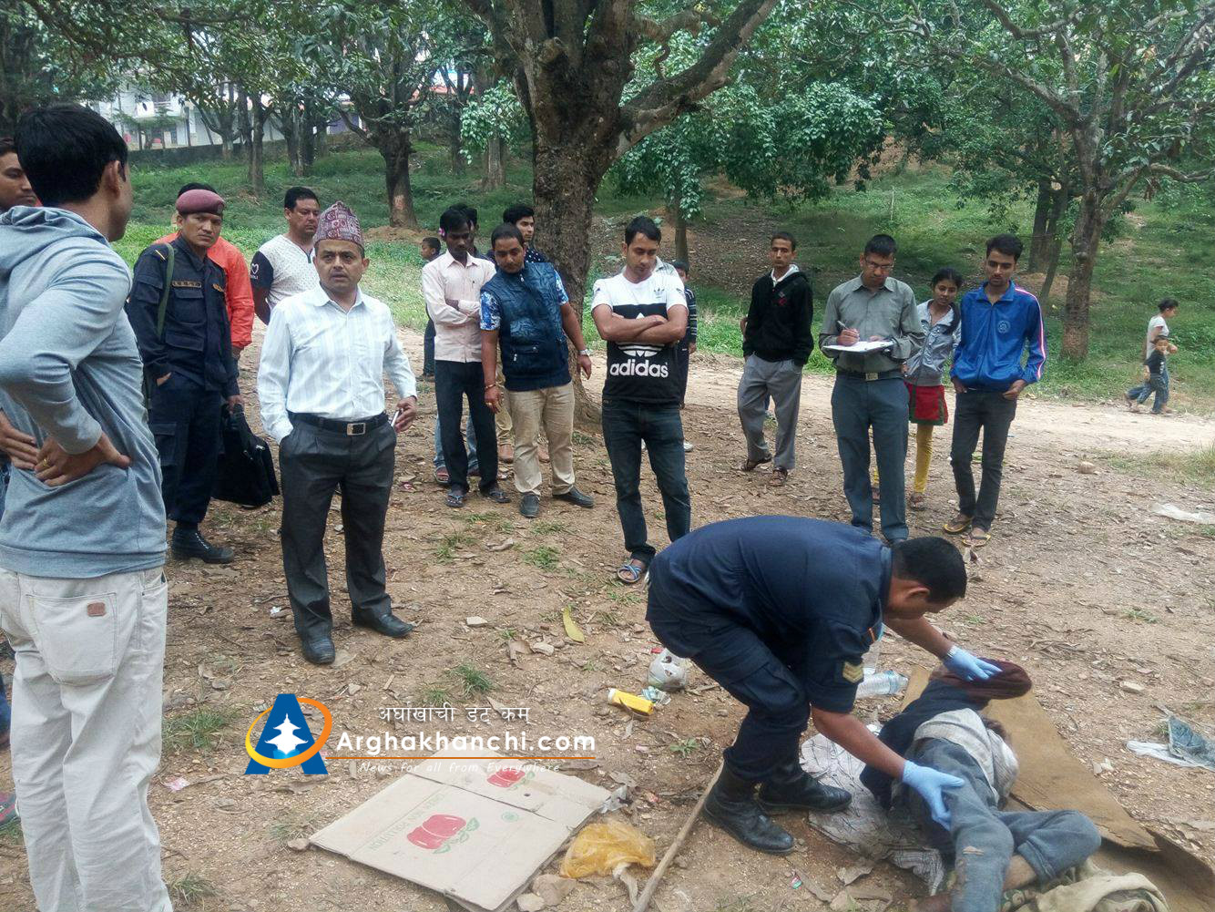 सन्धिखर्क नगरपालिकाको शान्ति बगैचामा ठाडा गाबिसका अन्दाजी ५५ वर्षिय अक्षय नेपाली मृत अवस्थामा परेका हुन् । सन्धिखर्कमा मजदुरी गर्दै आएका अक्षय केही दिन देखि विरामी रहेको बताइए पनि मृत्युको कारण खुल्न सकेको छैन ।