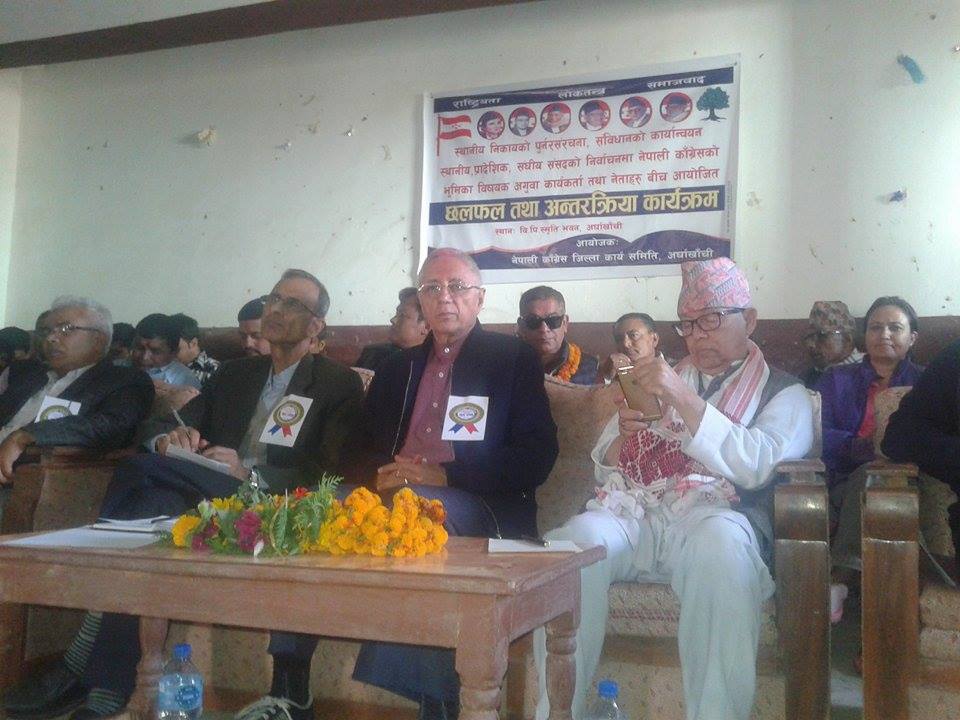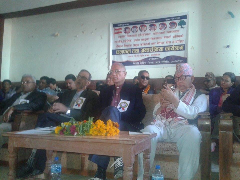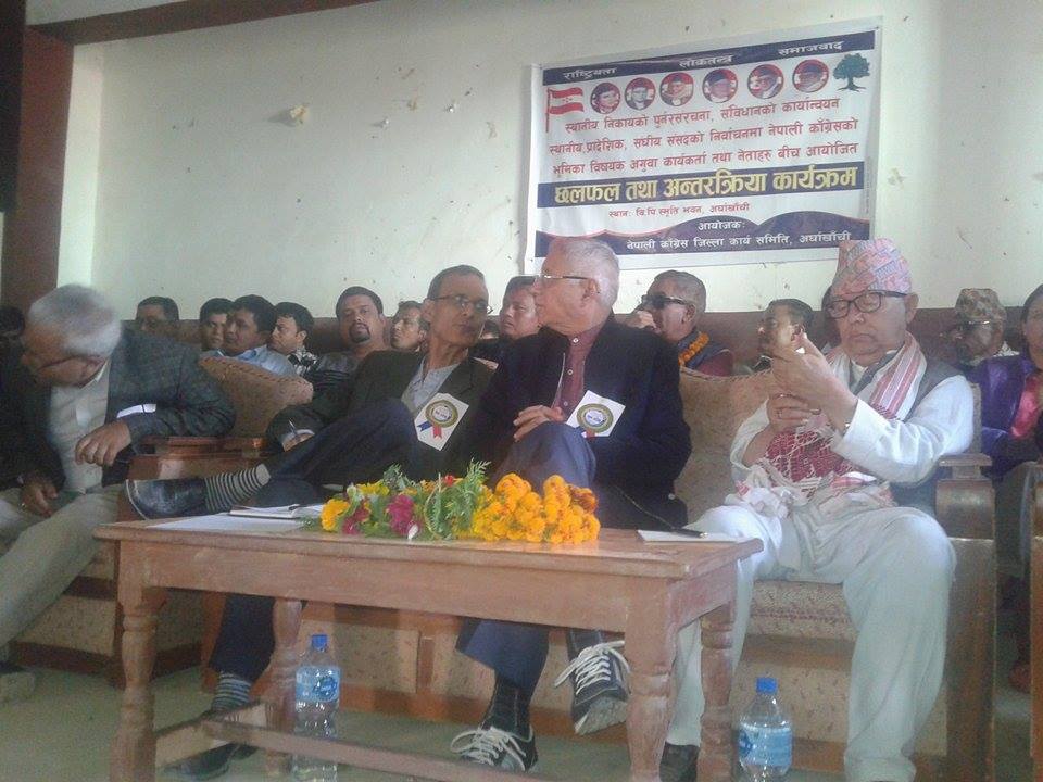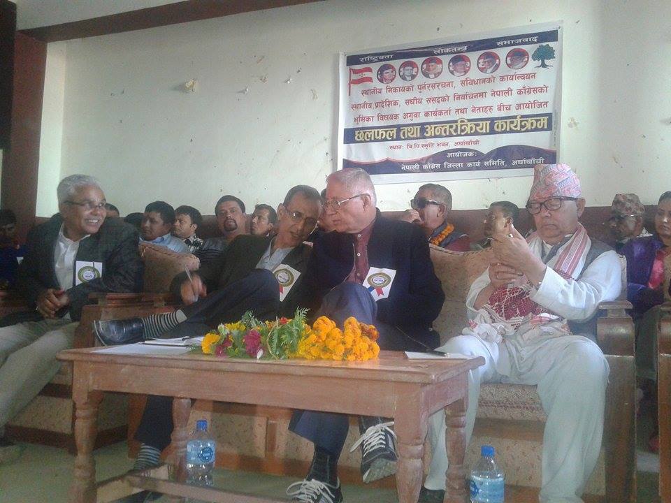 कार्यक्रममा नेपाली काङ्ग्रेसका केन्द्रीय सदस्य अानन्द ढुङगाना नेपाली काङ्ग्रेसका युबानेता सासद रन्जित कण पुर्ब केन्द्रीय सदस्य रेवती प्रसाद भुसाल नेपाल बिधार्थी संघका केन्द्रीय उपाध्यक्ष प्रकाश राना नेपाल प्रेस युनियनका केन्द्रीय सल्लाहकार बरिस्ठ पत्रकार शिव लम्साल प्रेस युनियनका केन्द्रीय सचिव खिला कार्की पुर्ब केन्द्रीय सदस्य शिव देपकोटा प्रेस युनियनका नेता नकुल अर्याल नेबि संघका सहमहामन्त्री ललिता सुनुबार महिला संघका केन्द्रीय सदस्य अनिता ज्ञवाली, नेपाली काङ्ग्रेस अर्घाखाँचीका पुर्बसभापति कमल प्रसाद भुसाल शिक्षक संघका पुर्व केन्द्रीय अध्यक्ष मोहन ज्ञवाली महासमिति सदस्य सुर्य प्रसाद अधिकारी, यादब घिमिरे, मिरा पान्डे, केशब श्रेष्ठ लगायतले मन्तब्य राख्नु भएको थियोे ।