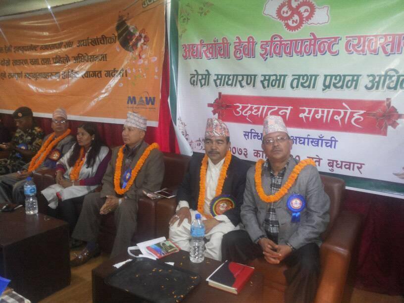 केन्द्रीय अध्यक्ष तारा बहादुर कुवरको प्रमुख अतिथ्यता प्रमुख जिल्ला अधिकारी कृष्ण बहादुर कटुवालको वरिष्ठअतिथ्यतामा भएको साधरण सभामा स्थानिय बिकास अधिकारी लक्ष्मि पान्डे गौतम सबुज गणका गणपति लक्ष्मिभक्त श्रेष्ठ, प्रहरी निरिक्षक सुजनराज भन्डारी, नेपाली काङ्ग्रेसका जिल्ला सभापति बिष्णु प्रसाद खनाल मुस्कान, नेकपा एमालेका सचिब रामबहादुर चौहान, नेकपा माअोबादी केन्द्रका सयोजक ठाकुर कुमार बिक, राष्ट्रिय जनमोर्चाका सचिब गोपाल पौडेल, बिप्लप माअोबादीका गोबिन्द खनाल, सहायक प्रजिअ नारायण खत्री, उधोग बाणिज्य संघका केन्द्रीय सदस्य कृष्ण प्रसाद श्रेष्ठ, निर्माण व्यवसायी संघका अध्यक्ष ऋषि राम अधिकारी, पत्रकार महासंघका अध्यक्ष सोभाखर पन्थि, होटल ब्यवसायी नोलराज भन्डारी, नेपाल प्रेस युनियनका अध्यक्ष सुर्य प्रसाद भुसाल, निर्माण ब्यबसायी कबि खनाल, देउराली यातायातका महासचिब प्रेम पान्डे, पत्रकार सहयोगी बिसी लगायतले इक्विपमेन्ट व्यवसायीले जनमुखि काम गरेको बताउनु भएको थियोे ।