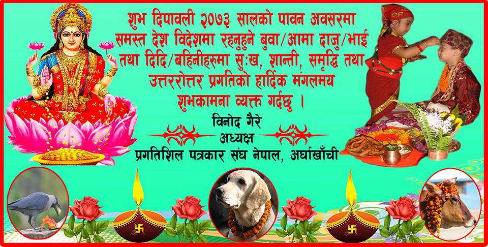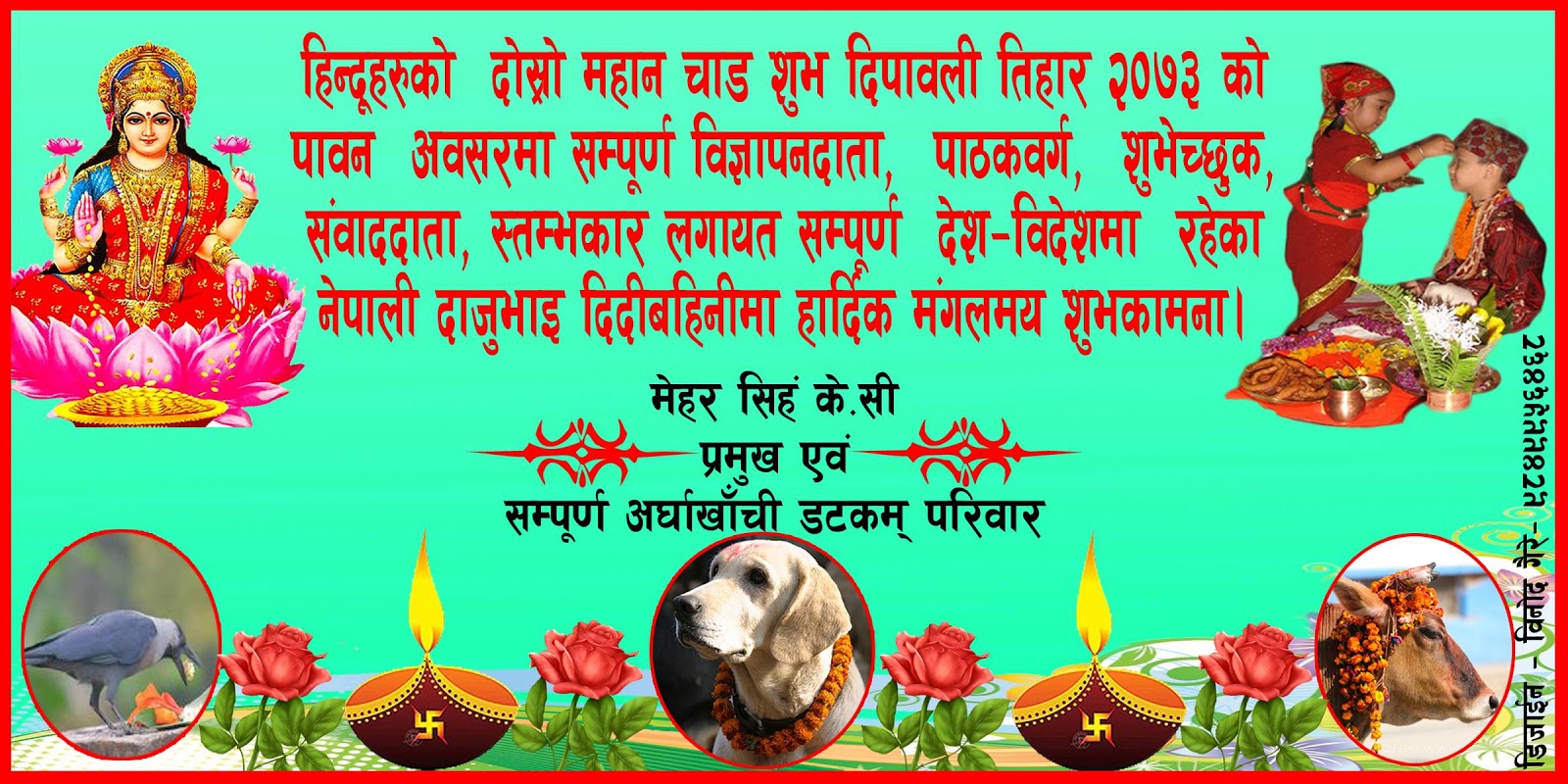 *हिन्दूहरुको दोस्रो महान चाड शुभ दिपावली तिहार २०७३ को पावन अवसरमा सम्पूर्ण विज्ञापनदाता, पाठकवर्ग, शुभेच्छुक, संवाददाता, स्तम्भकारलगायत सम्पूर्ण देश-विदेशमा रहेका नेपाली दाजुभाइ दिदीबहिनीमा हार्दिक मंगलमय शुभकामना ।