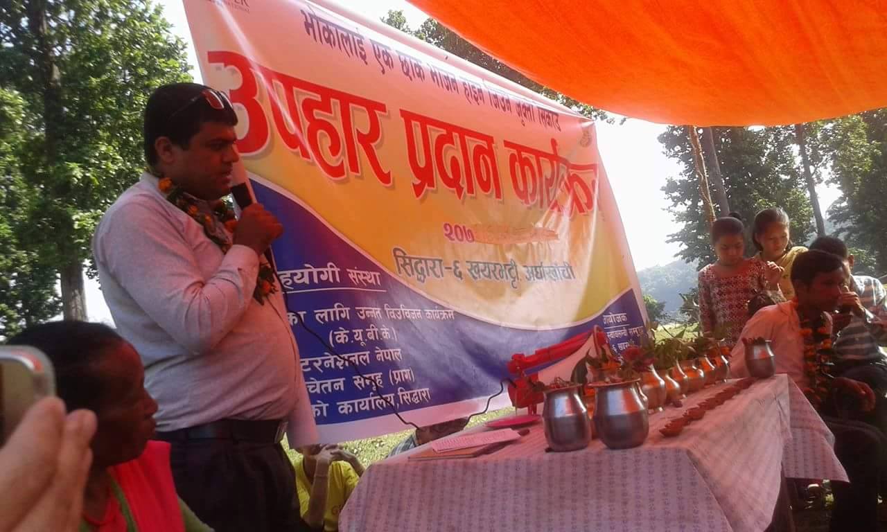 हेफर इन्टेरनेशनल नेपालबाट सन्चालित “भोका लाई एक छाक भोजन होइन जिउने जुक्त्ती सिकाउ” भन्ने मुल नारा उपहार प्रदान कार्यक्रम सिद्दारा – ६ खयरभट्टीमा सम्पन्न भएको हो ।