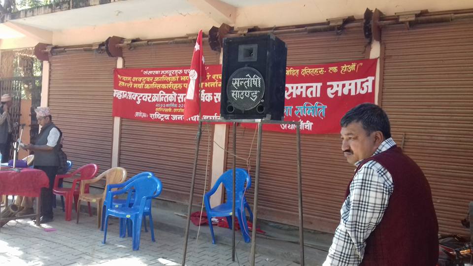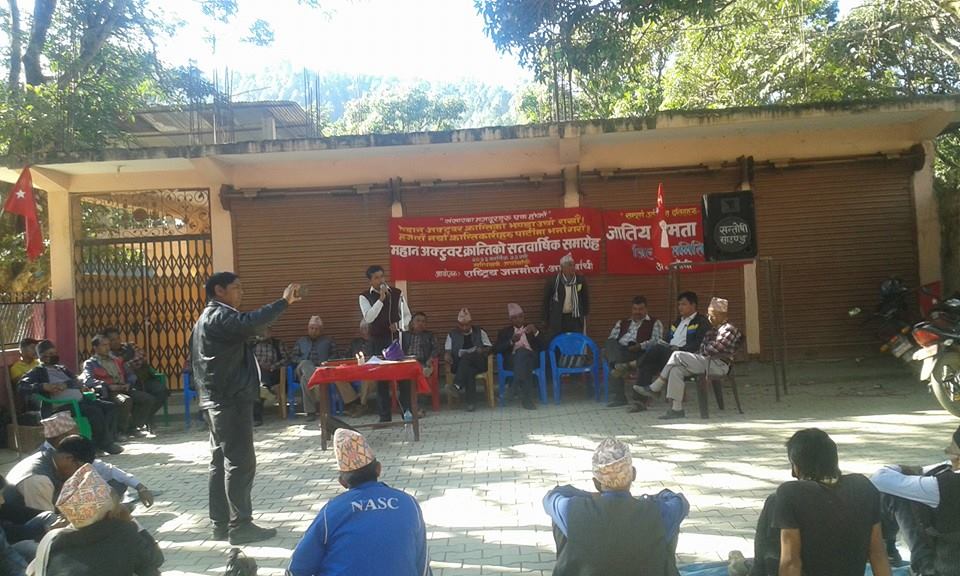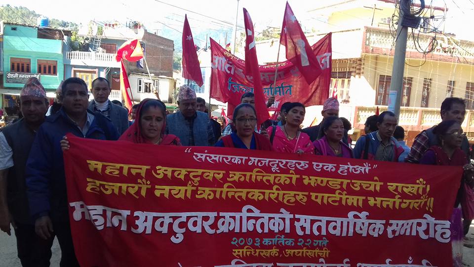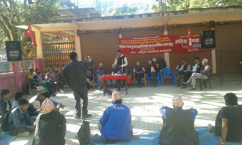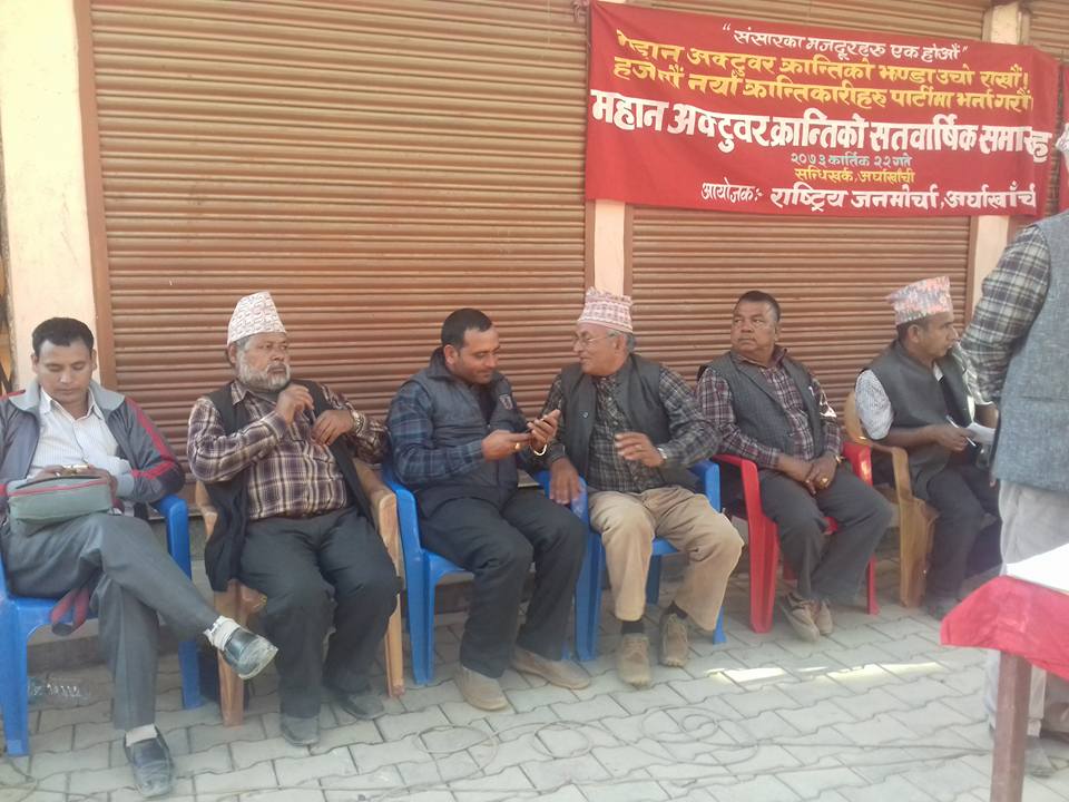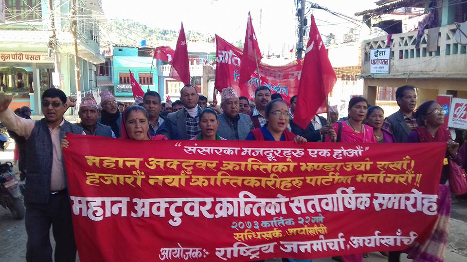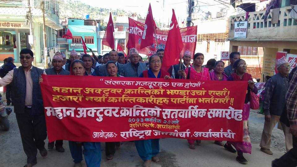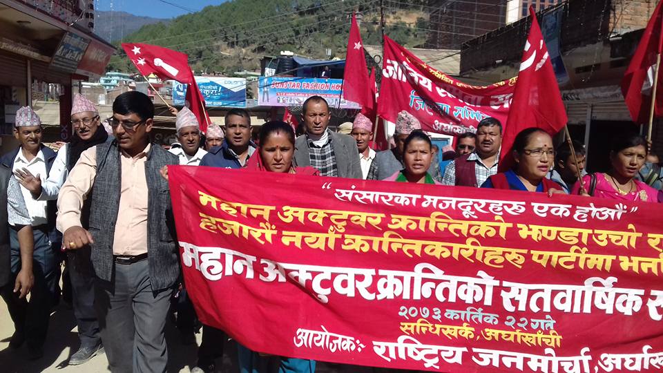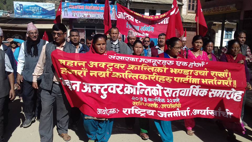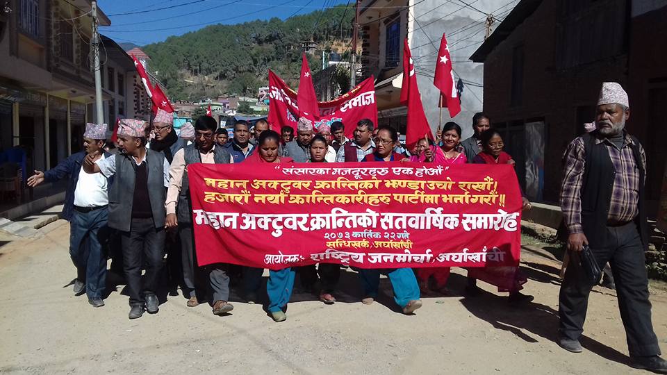सन्धिखर्क, अर्घाखाँची ( अर्घाखाँचीडट्कम) । महान अक्टुवर क्रान्तिको झन्डा उचाे राखाै । हजाराै नयाँ क्रान्तिकारीहरु पार्टीमा भर्ना गरौं ।। भन्ने मुल नाराका साथ राष्ट्रिय जनमोर्चा अर्घाखाँचीको आयोजनामा महान अक्टुवर क्रान्तिको सतवार्सिक समारोहको उद्घाटन भएको छ ।