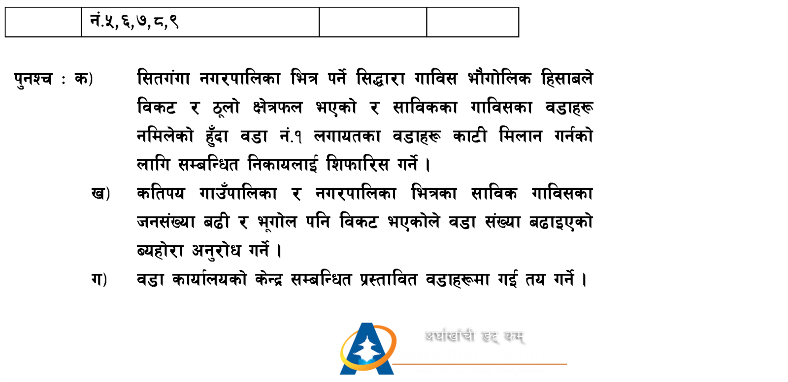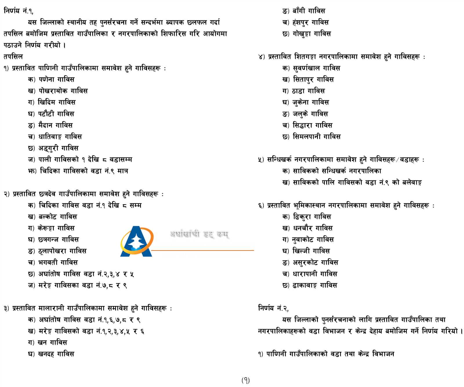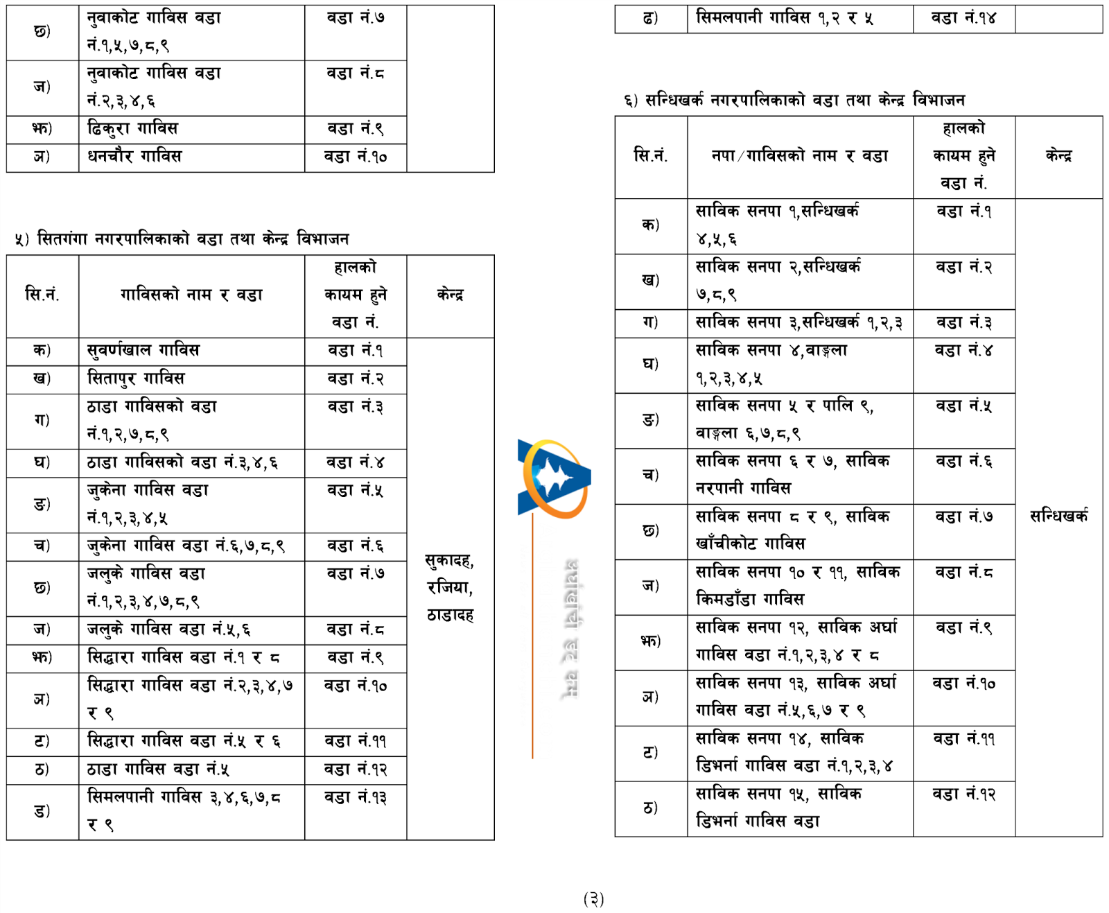 (१) सन्धिखर्क नगरपालिकामा साविक सन्धिखर्क बाहेक पाली गाविसको वार्ड नं. ९ बलेवाङ थपिएको छ ।