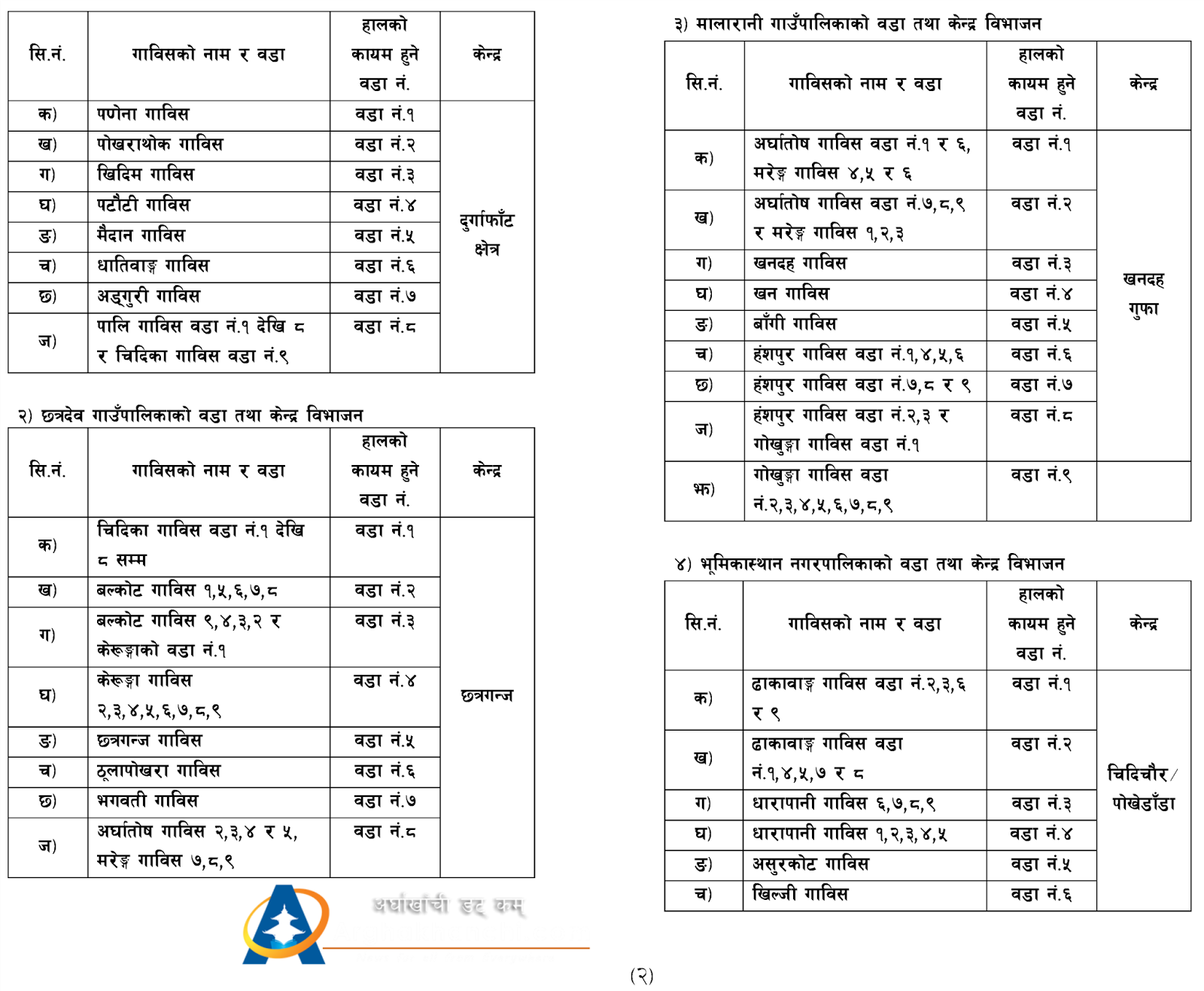 (३) धारापानी, ढाकावाङ, नुवाकोट, खिल्जी, असुरकोट, धनचौर र ढिकुरालाई समेटेर भूमिकास्थान नगरपालिका बनाइएको छ । यसको केन्द्र प्राविधिक अध्ययनपश्चात् तय गरिने छ ।