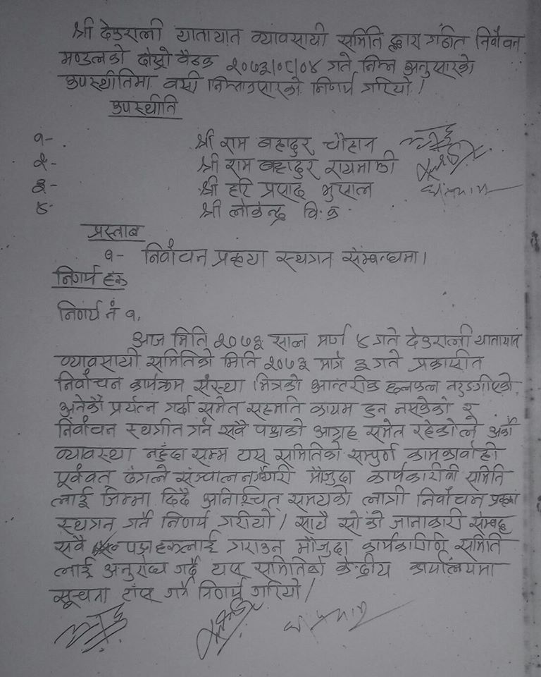 संस्था भित्रको आन्तरीक छलफल नटुङगीएको,अनेकौ प्रयत्न गर्दा समेत सहमति कायम हुन नसकेको र निर्वाचन स्थगीत गर्न सबै पक्षको आग्रह समेत रहेकोले अर्को ब्यबस्था नहुँदा सम्म यस समितिको सम्पूर्ण कामकार्वाही पूर्बवत ढंगले सञ्चालन गर्ने गरी मौजुदा कार्यकारीणी समिति लाई जिम्मा दिदै अनिश्चित समयको लागी निर्वाचन प्रकृया स्थगन गर्ने निर्णय गरेको छ ।