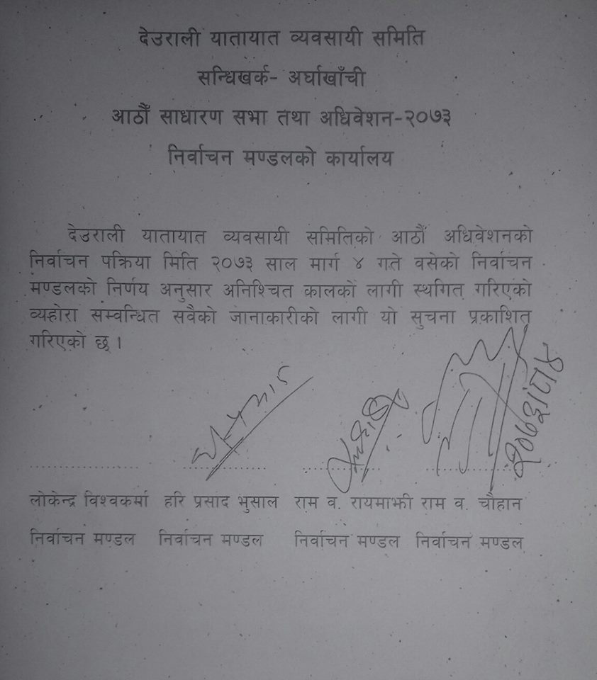 सन्धिखर्क, अर्घाखाँची ( अर्घाखाँचीडट्कम) । देउराली यातायात व्यवसायी समिति अर्घाखाँचीको आठौं अधिवेशनको निर्वाचन प्रकृया २०७३ मंसिर ४ गते बसेको निर्वाचन मण्डलको निर्णय अनुसार अनिश्चित समयको लागी निर्वाचन सम्बन्धी सम्पूर्ण प्रकृया स्थगन गर्ने निर्णय गरेको छ ।