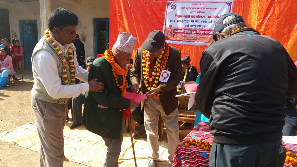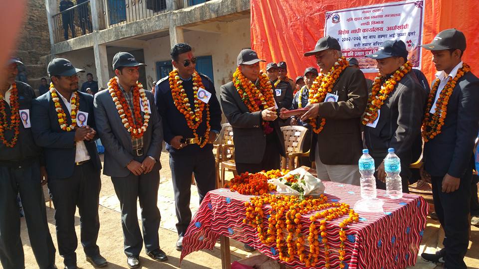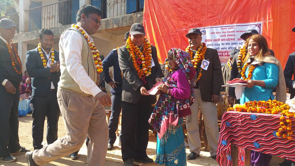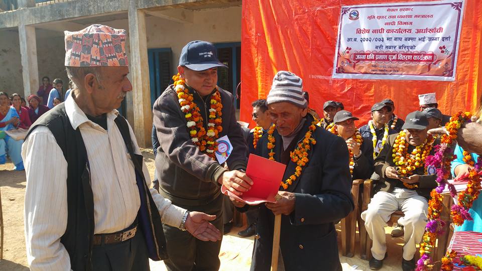 बिषेश नापी कार्यालय अर्घाखाँचीको टोली नम्बर २ अन्तरर्गत धनचौरको अायोजनामा धनचौरमा तयार पारिएका जग्गा धनि लालपुर्जा एक समारोहका बिच धनचौरबासीलाई बितरण गरिएको हो ।