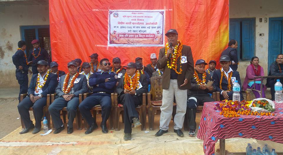 लालपुर्जा बितरण समारोहमा बोल्दै प्रमुख जिल्ला अधिकारी कृष्ण बहादुर कटुवाले जनताको चाहाना अनुसारको बिकाश निर्माण लाई अगाडि बढाउन अाफुले सहयोग गर्ने बताउनु भयो । उहाले बिशेष नापी कार्यालयले निकै मिहिनेतीका साथ काम गरेको बताउदै कर्मचारीहरुलाई धन्यबाद दिनु भएको थियोे ।