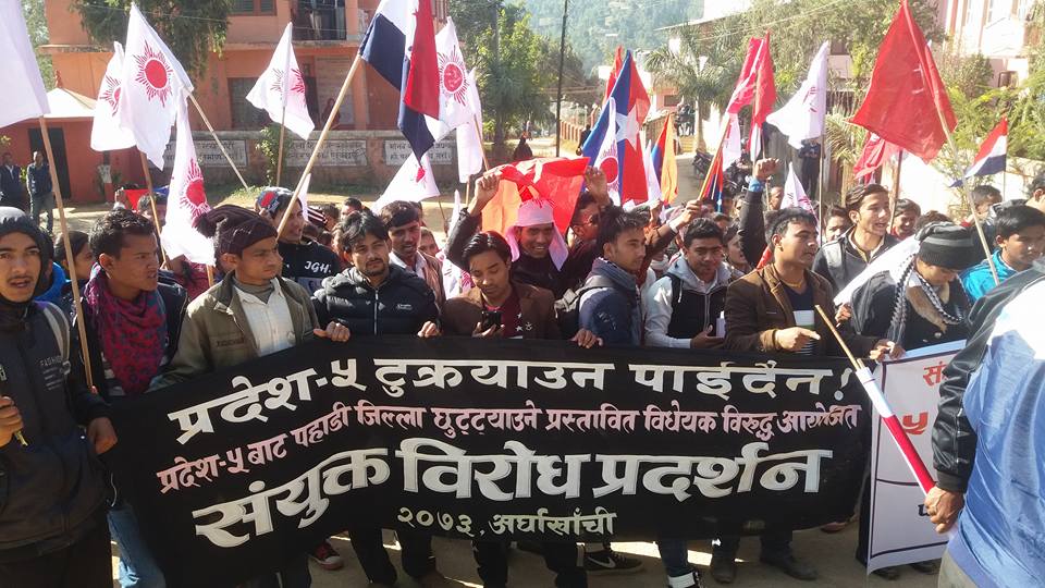 सन्धिखर्क, अर्घाखाँची मंसिर १५ । सरकारले जनभावना विपरित प्रदेश विभाजन गरेको भन्दै   जिल्लाका  सबै राजनीतिक दलहरु आन्दोलन गर्ने विषयमा  सहमत भएका  छन् । उनीहरुले संयुक्त संघर्ष समिति गठन गरि  आन्दोलनलाई चक्राउने निर्णय  गरेका छन् ।