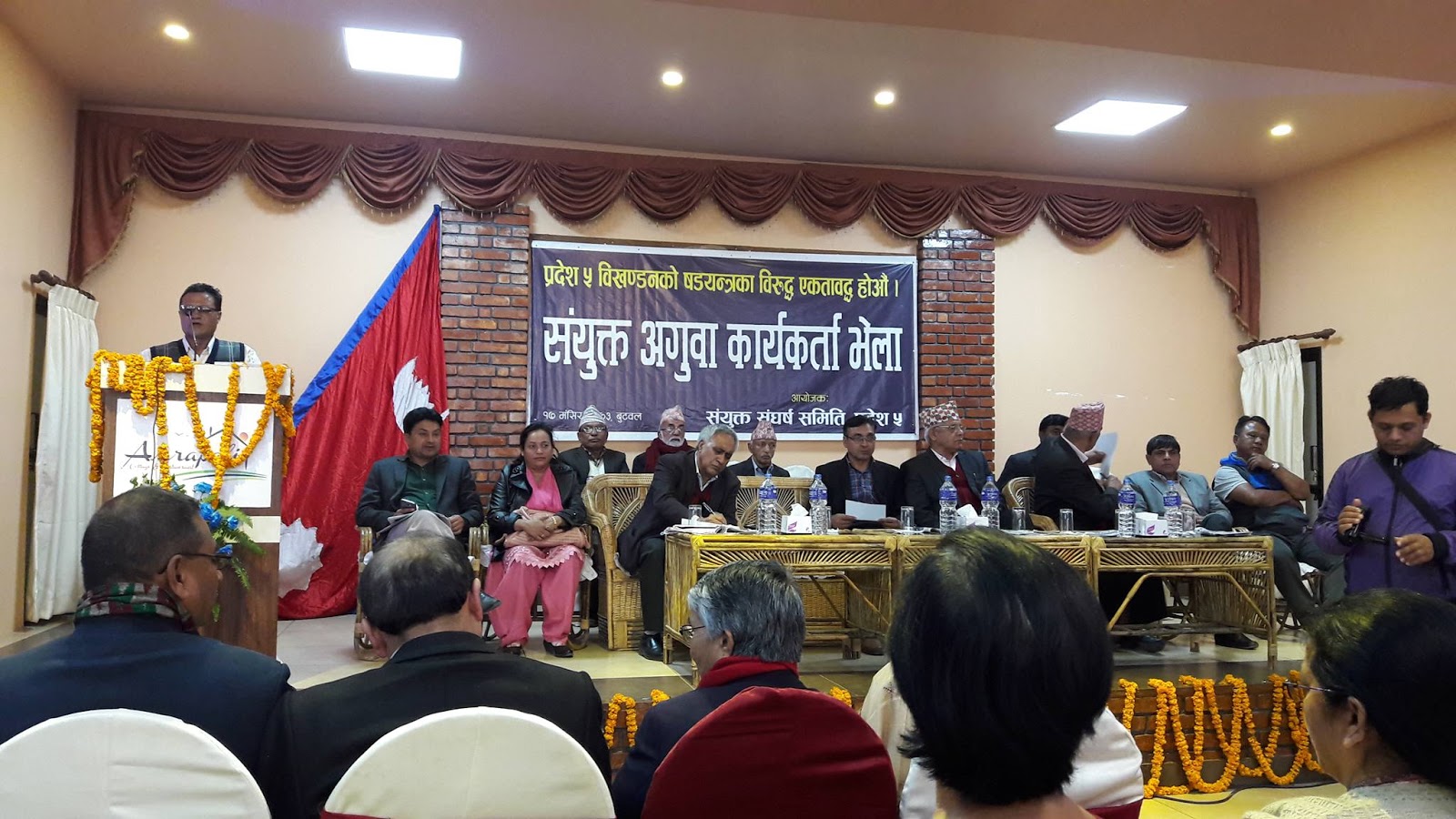कार्यक्रममा उपमहासचिब घनश्याम भुसालले पाँच नम्बर प्रदेश टुक्राउने निणय जनताको अान्दोलनले प्रररास्त गर्ने चेतावनी दिनु भयो । कार्यक्रममा नेपाली काङ्ग्रेसका केन्द्रीय सदस्य देबेन्द्द राज कडेल, नेकपा एमालेका नेताहरु छबिलाल बिश्वकर्मा लगायत गुल्मि कपिलवस्तु प्युठान रुकुम रोल्पा पाल्पा अर्घाखाँची दाङ लगायतका जिल्लाका बिभिन्न पार्टीका नेताहरु कार्यकर्ताहरु रुपन्देही पुगेका थिए ।