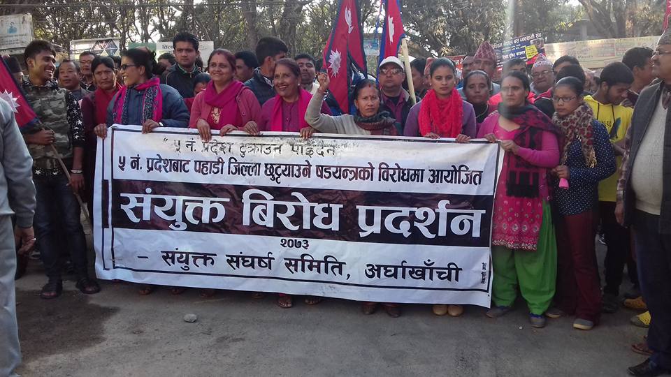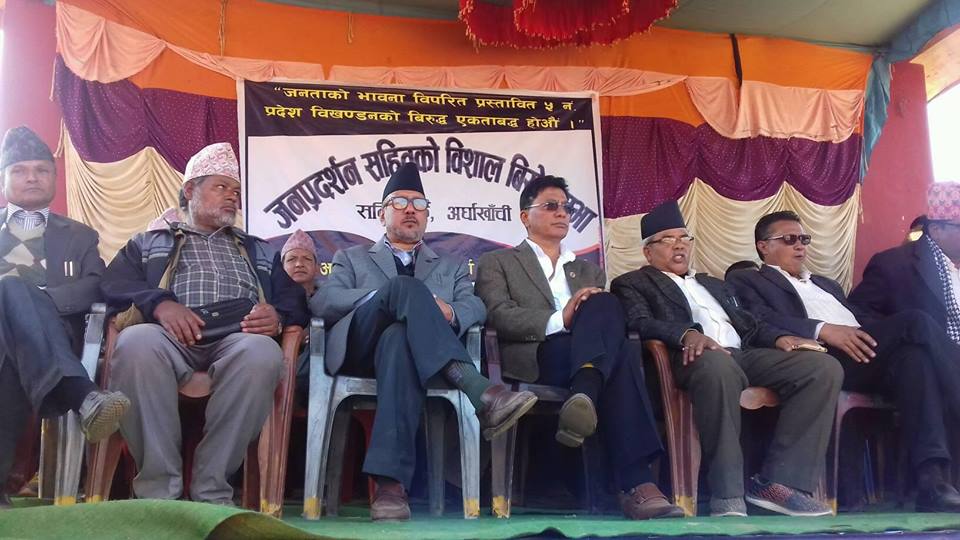 सन्धिखर्कमा  भएको बिशाल सभालाई सम्बोधन गर्दै नेकपा एमालेका युवा नेता तथा सासद डाक्टर दुमन सिह थापाले तराई  पहाड अलग गराउने सरकारको निर्णय कुनै हालतमा सफल नहुने बताउदै अान्दोलनको अाधिबेरिबाट सरकारले संसदमा दर्ता गरेको प्रस्ताव असफल पार्ने चेताबनी दिनु भयो । उहाले बिबादै नभएको ५ नम्बर प्रदेशमा सरकारले फुटालेर जनता सडकमा ल्याउनु सरकारको लापरबाहि भएको बताउदै अान्दोलनमा साथ दिनका लागि सबै जनसमुदायलाई अपिल गर्नु भयो ।