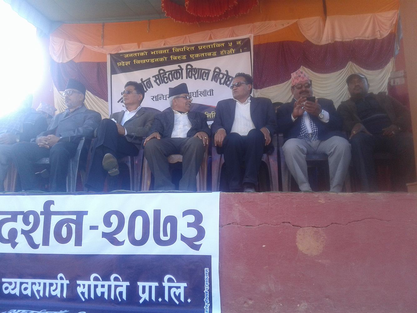 कार्यक्रममा नयाँ शक्ति पार्टीका नेता यमुना भुसाल, परिबार दलका अध्यक्ष डिल्लिराज भुसाल, उधोग बाणिज्य संघका केन्द्रीय सदस्य कृष्ण प्रसाद श्रेष्ठ नेपाल पत्रकार महासंघका सभापति सोभाखर पन्थि अन्तरपार्टी महिला संघका अध्यक्ष सुसिला गैरे लगायतले ५ नम्बर प्रदेश कुनै पनि हालतमा टुक्राउन नदिने चेतावनी दिनु भयो ।