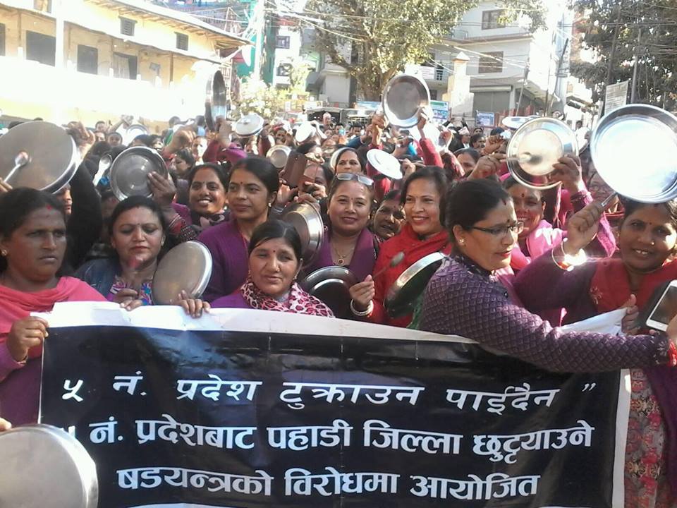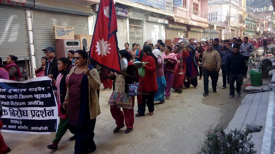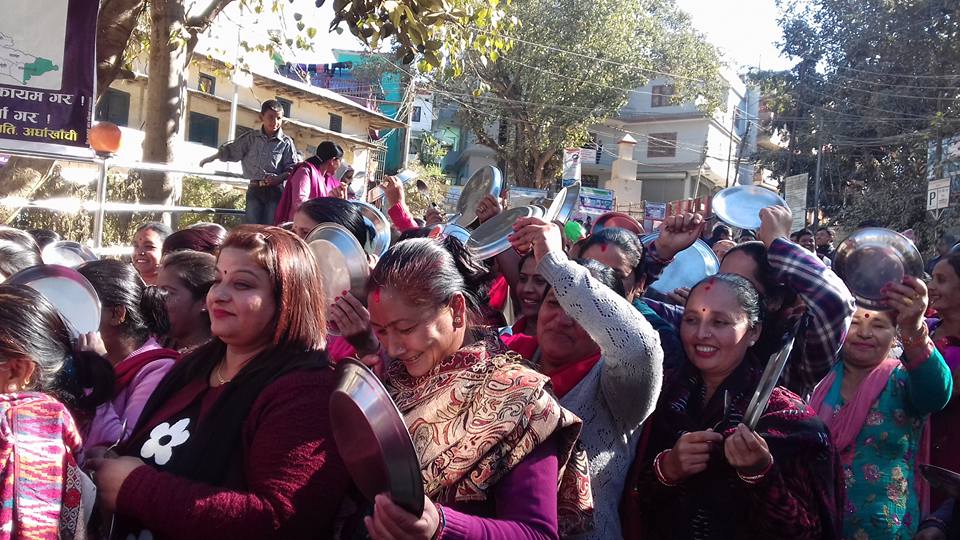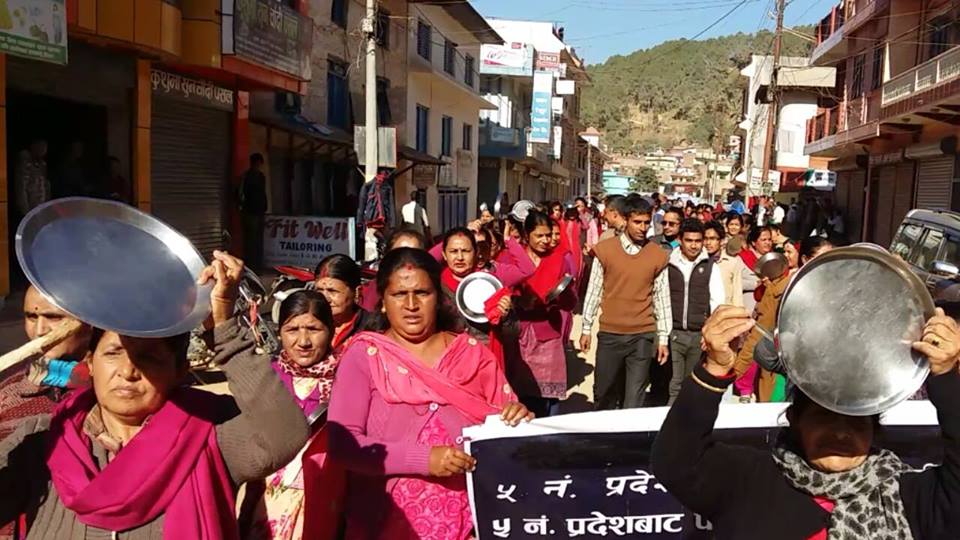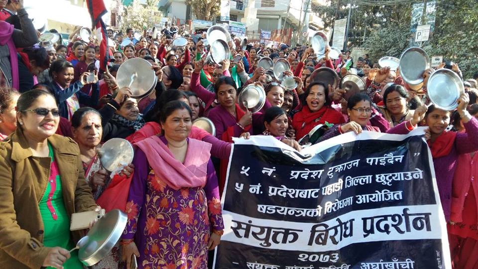 सन्धिखर्क, अर्घाखाँची ( अर्घाखाँचीडट्कम) । पाँच नम्वर प्रदेशबाट हटाउने प्रस्ताव संसदमा दर्ता भएको विरोध अर्घाखाँचीको सन्धिखर्कमा महिलाहरुले रित्तो थाल ठटाएर प्रदर्शन गरेका छन् ।