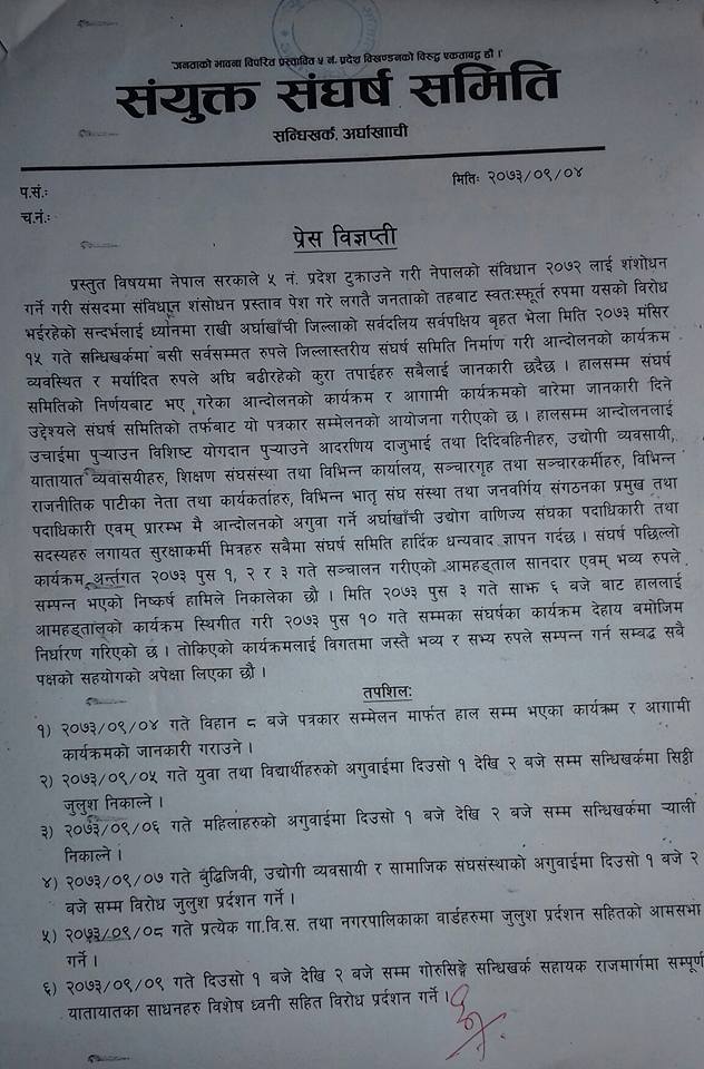 सोमबार बिहान सन्धिखर्कमा संयुक्त सङघर्ष समितीले पत्रकार सम्मेलन गरी थप आन्दोलनका कार्यक्रम सार्वजनिक गरेको हो ।