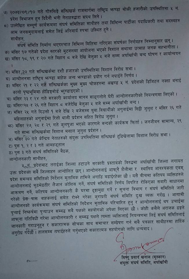 नयाँ आन्दोलनका कार्यक्रम अनुसार पुस ५ गते सम्पुर्ण पार्टी आबद्ध तथा युवा, विद्यार्थीहरुको अगुवाइमा सम्पुर्ण जनसमुदायहरुको सहभागीतामा सदरमुकाम सन्धिखर्कमा १ बजेदेखी २ बजेसम्म सिट्ठी जुलुस सहित कोणसभा गर्ने रहेको छ ।