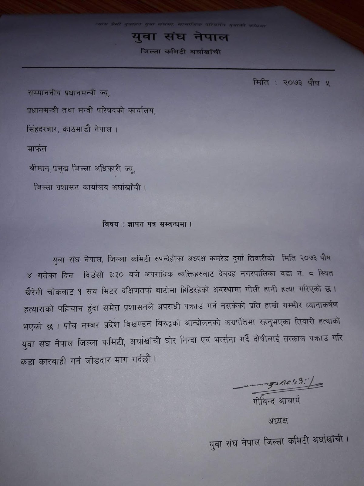 भगवती, अर्घाखाँची ५ मङ्सिर । नेकपा एमालेको भातृ संगठन युवा संघ रुपन्देही जिल्ला अध्यक्ष दुर्गा तिवारीको हिजो भएको योजनाबद्द कायरतापुर्ण निर्मम हत्त्याको बिरुद्द आज अर्घाखाँचीमा पनि युबा संघ भगवती, छत्रगन्ज, केरुङा, अर्घातोषको संयुक्त आयोजनामा -र्याली प्रर्दशन तथा सभा सम्पन्न भएको छ ।