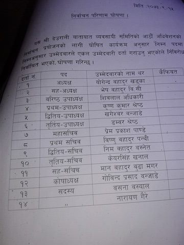 एकमहिना अगाडि हुनुपर्ने अधिबेशन दल निकट ब्यबसायीहरु बिच बिबाद भएपछि अधिबेशन स्थगित भएको थियोे । अधिवेशनबाट निर्बाचित पदाधिकारीहरुलाई निर्वाचन समितिका संयोजक हरि प्रसाद भुसाल सदस्यहरु लोकेन्द्र बिक, राम बहादुर चौहान, राम बहादुर रायमाझी लगायतले प्रमाणपत्र तथा पदतथा गोपनियताको सफत ग्रहण गराउनु भएको थियोे ।