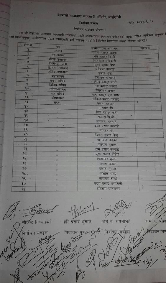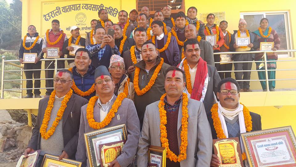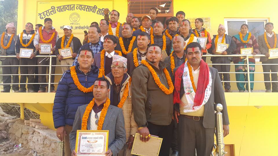 देउराली यातायात ब्यबसायी समितिको अध्यक्षमा योगेन्द्र खड्का सहअध्यक्षमा भेष बहादुर बिसी वरिष्ठ उपाध्यक्षमा शिवलाल अधिकारी उपाध्यक्षमा कृष्ण प्रसाद श्रेष्ठ, खगेश्वर बन्जाडे, डम्मर श्रेष्ठ, महासचिबमा प्रेम प्रकाश  पान्डे, सचिबमा बिष्णु पन्थि निम बहादुर बस्नेत केयर सिंह खनाल सहसचिवमा मान बहादुर बुढामगर कोषाध्यक्षमा गोबिन्द बन्जाडे तथा सदस्यहरुमा वसना बस्याल, नारायण गैरे, प्रकाश पिसी, शिव बहादुर खत्री, भुवान्द बन्जाडे, कृष्ण प्रसाद पौडेल, बामदेब गैरे, दिपक कुमार श्रेष्ठ, नारायण खड्का, बलाराम भुसाल, राम प्रसाद बन्जाडे, कृष्ण प्रसाद पौडेल पिताम्बर भुसाल, राम प्रसाद बन्जाडे, पिताम्बर भुसाल, प्रकाश खनाल, असोक श्रेष्ठ, केशब भुसाल, नारायण रेग्मी, पदम प्रसाद मरासिनी, देबिराम घर्ति गरि ३१ सदस्यीय नयाँ सन्चालक समिति गठन गरेको देउराली यातायत ब्यबसायी समितिले पत्रकार सम्मेलन गरेर जानकारी गराएको हो ।