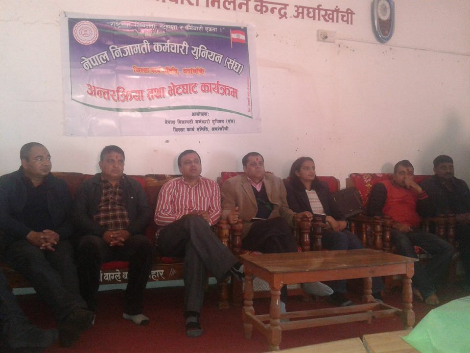 नेपाल निजामती कर्मचारी युनियन (संघ) अर्घाखाँचीको सातौ जिल्ला अधिवेशन शनिबार सन्धिखर्कमा हुने भएको छ । सन्धिखर्कमा अाज आयोजना गरिएको अन्तर्कृया कार्यक्रममा संघका जिल्ला अध्यक्ष प्रकाश भट्टराईका बताए अनुसार भोलि बिहान ११ बजे देखि जिल्ला विकास समितीको सभाहलमा हुने अधिवेशनको तयारी पुरा भएको छ ।