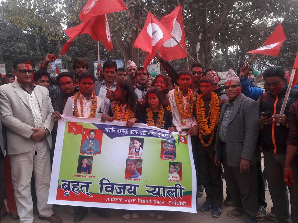यसै गरी अर्घाखाँची जिल्लाको एकमात्र शैक्षिक धरोहरका रुपमा परिचित पाणिनी बहुमुखी क्याम्पसमा नेपाल विद्यार्थी संघ, क्रान्तिकारी, विप्लव र नयाँ शक्ती सहितको संयुक्त प्यानल भारी मतले विजयी भएको छ ।