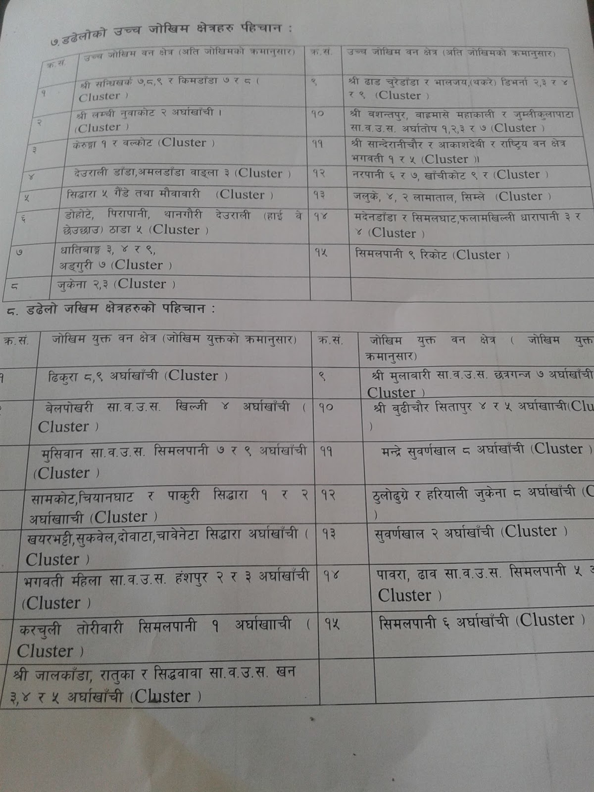उच्च जोखिम अागोलागिका क्षेत्र हरु बन कार्यलयले पैचान गरेका ठाउँहरु:-