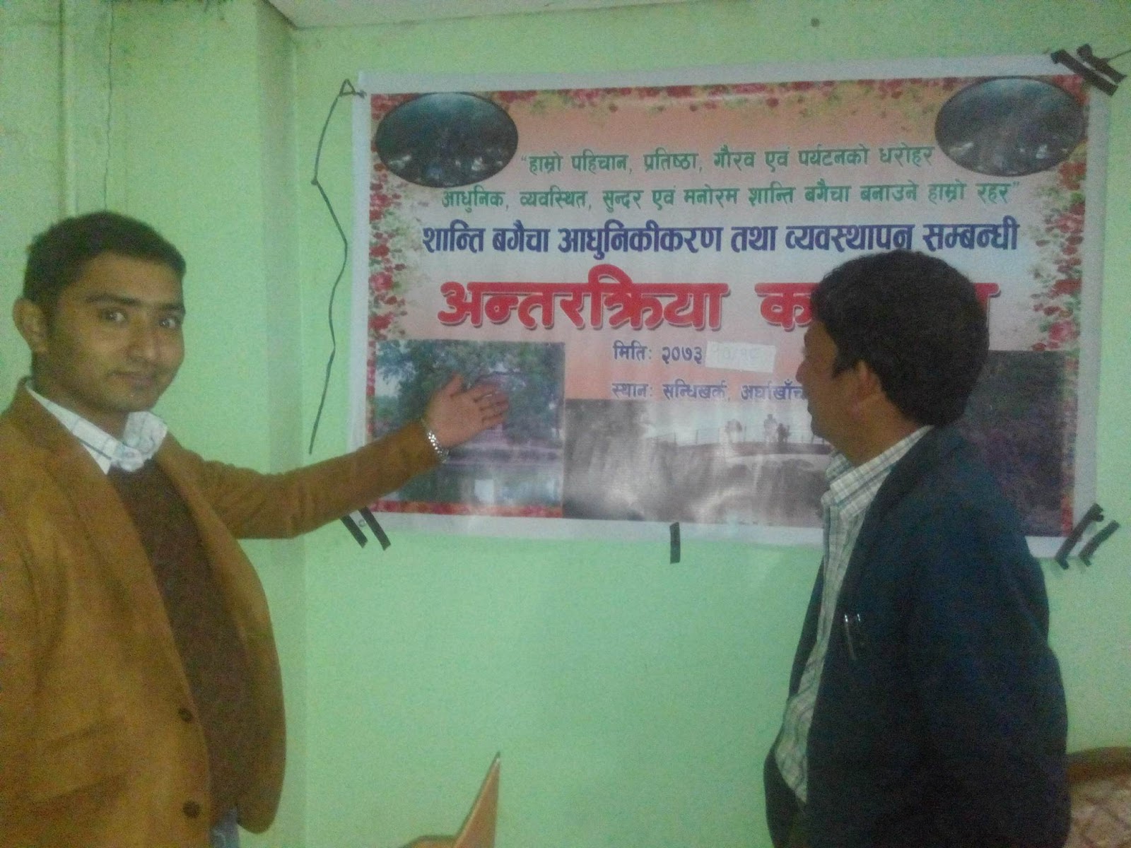 कार्यक्रममा जिल्लाको सन्धिखर्कमा रहेको शान्ति बगैचाकाे अाधुनिकरणका अभियानकर्ता सहायक जिल्ला प्रमुख नारायण खत्रीले शान्ति बगैंचा पूननिर्माण बारेमा सरोकारवालाहरुलाई जानकारी गराएका थिए ।