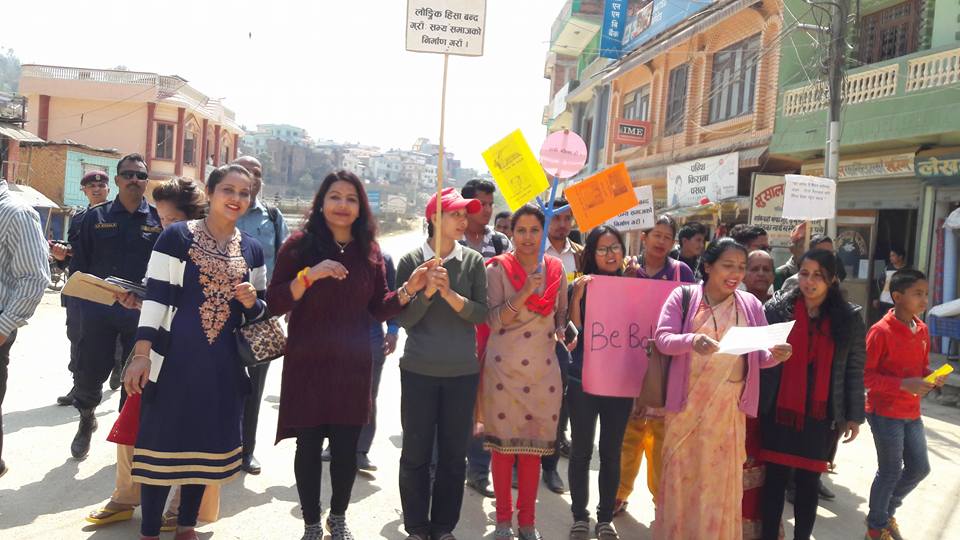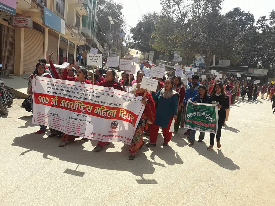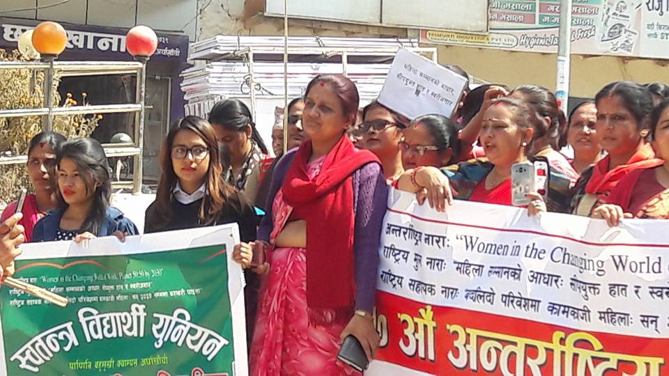 महिला अधिकारका लागि कार्यरत विभिन्न संघ संस्थाले निकालेको र्याली नगरको विभिन्न ठाउँको परिक्रमा गरि सन्धिखर्कको शान्ती बगैचा पुगी सभामा परिणत भएको थियो ।