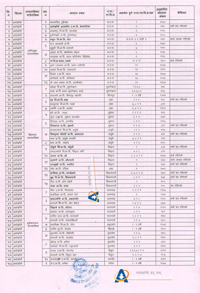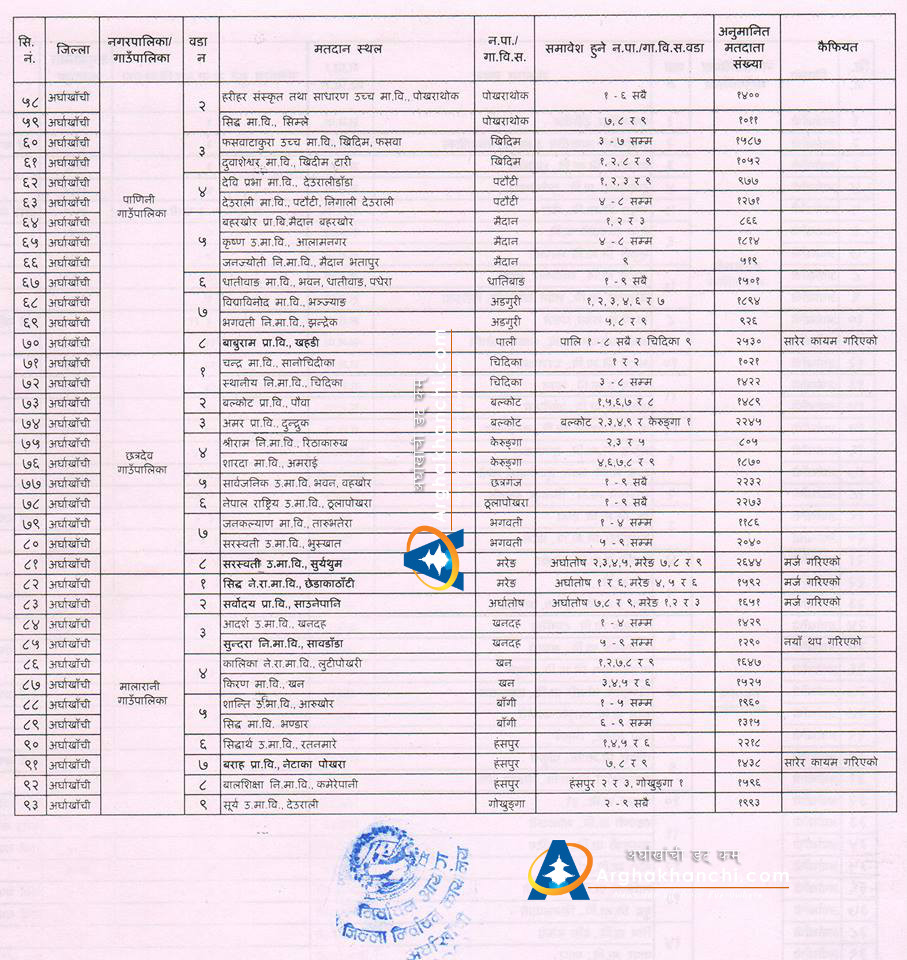जिल्ला निर्वाचन कार्यालय अर्घाखाँचीले सार्वजनिक गरेको मतदान स्थलहरुमा स्थानीय तहको संरचना अनुसार थपघट गरिएको छ ।