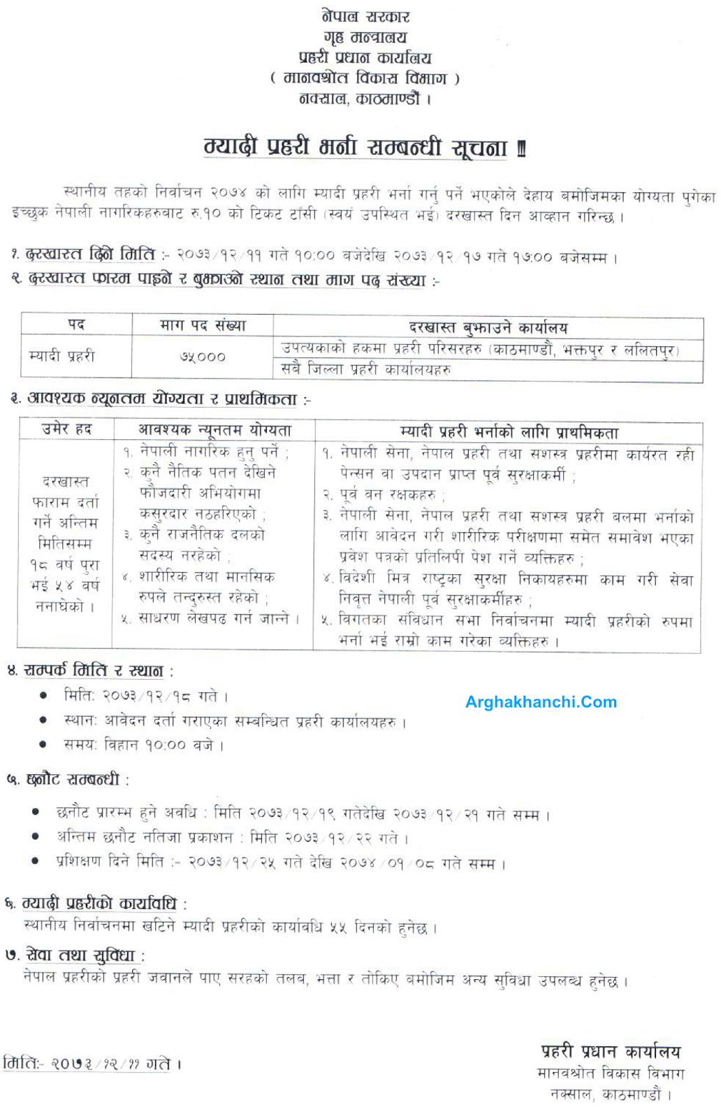 बैशाख ३१ गते तोकिएको स्थानीय तह निर्वाचनको लागि नेपाल प्रहरीले देशभर ७५ हजार म्यादी प्रहरीमा भर्ना खुलाएको छ ।
