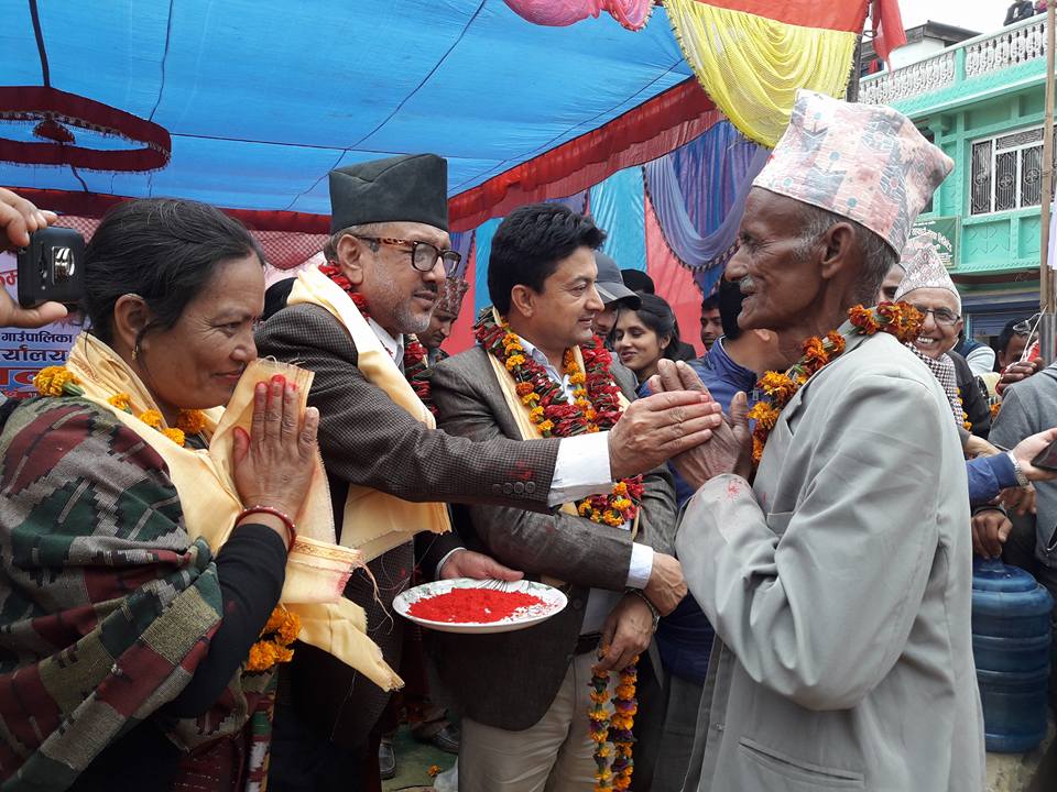 एमाले सचिव विष्ट र केन्द्रीय सदस्य मियाँलाई नवप्रवेशीहरुलाई फुलमाला र टिका लागाइदिएर पार्टीमा स्वागत गर्न भ्याइनभ्याइ भएको थियो  । एकै पटक धेरै व्यक्तिलाई  पार्टीमा स्वागत गर्न पाएकोमा एमालेका नेता